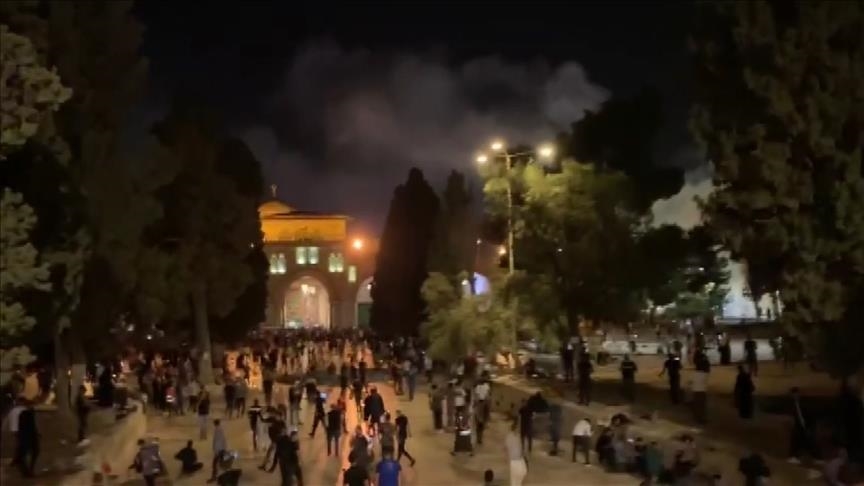 Israeli forces once again stormed the Al-Aqsa Mosque, assaulted Palestinian worshippers and fired sound bombs that caused a fire to break out in trees inside the Al-Aqsa compound on Monday evening.