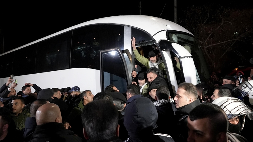 An Anadolu correspondent said a bus carrying dozens of released Palestinian prisoners accompanied by teams from the International Red Cross arrived at the Cultural Palace, where their families were waiting.