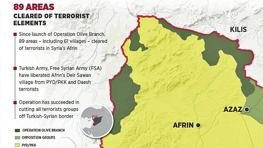 Since the launch of the operation on Jan. 20, Turkish military and the FSA liberated 86 targets -- including one center of a district --, 60 villages, 20 strategic mountains hills and one YPG/PKK-Daesh base.