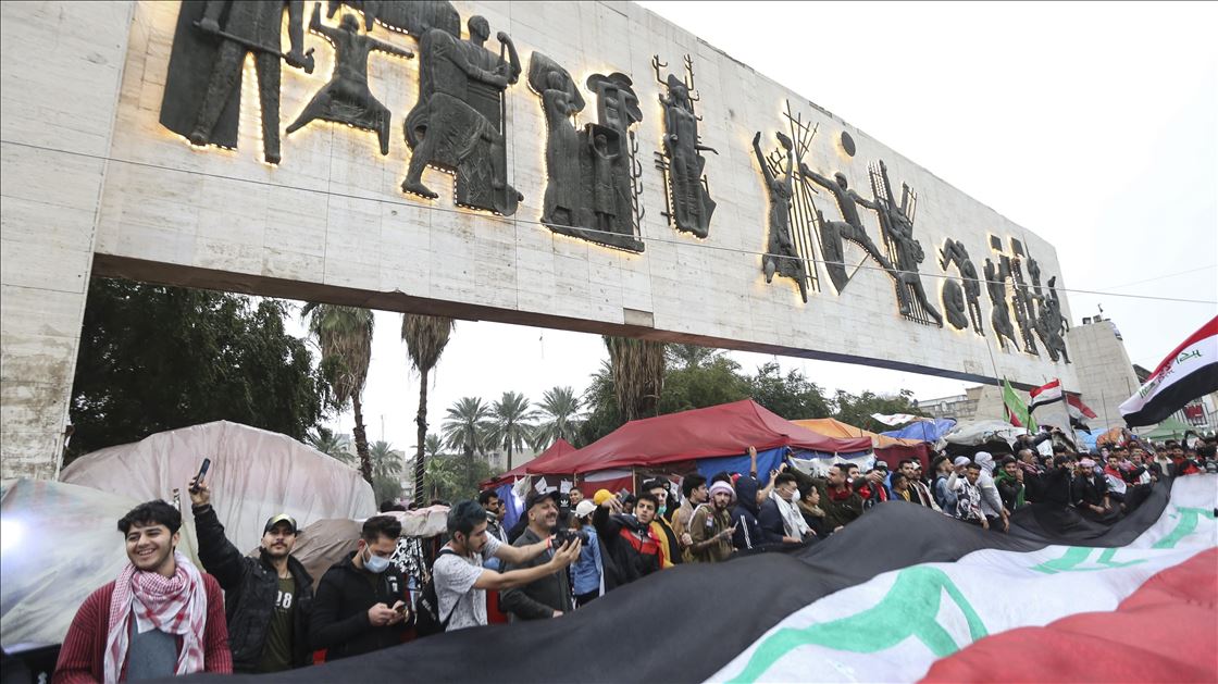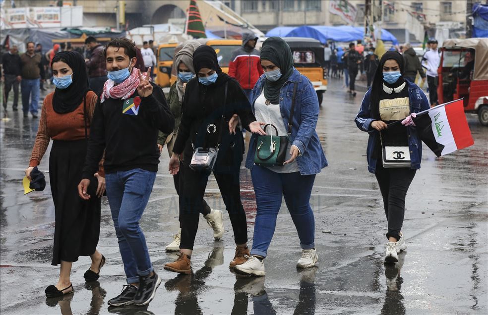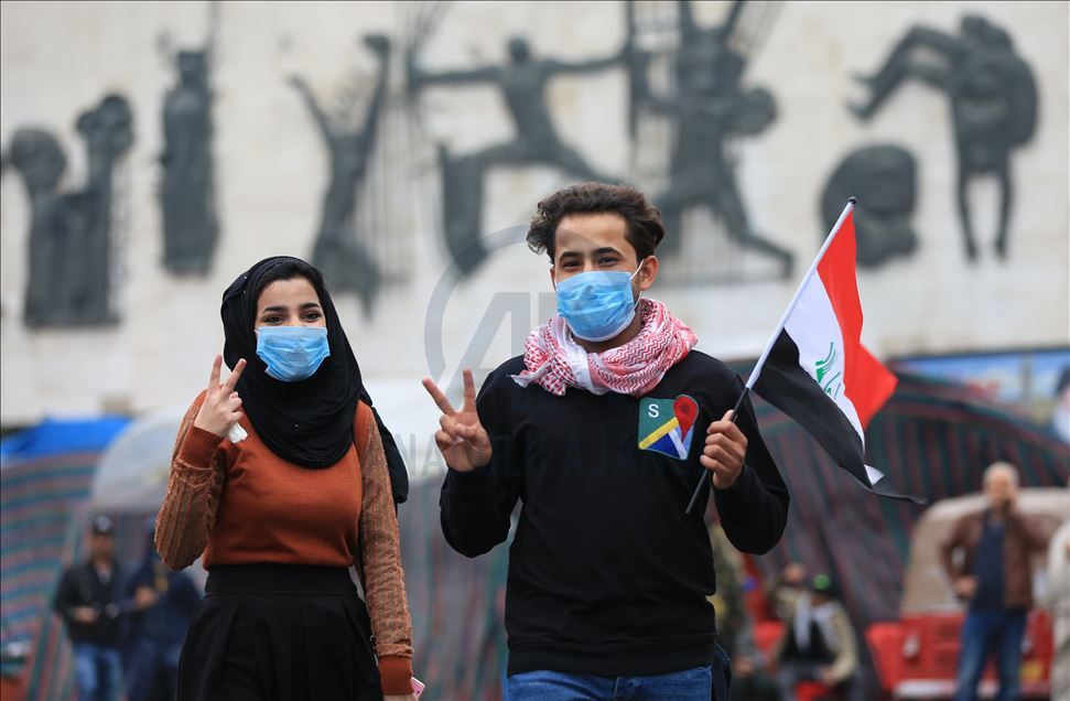 BAGHDAD, IRAQ - FEBRUARY 25: Iraqi demonstrators gather for anti-government protest at Tahrir Square in Baghdad, Iraq on February 25, 2020. Some demonstrators, wearing face masks, demand to increase precautions against coronavirus.