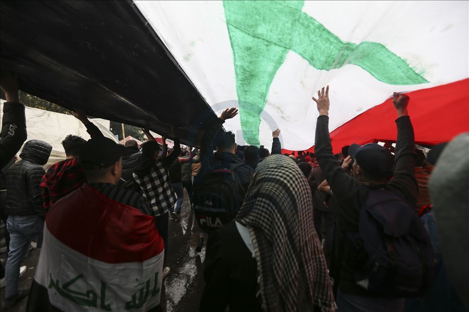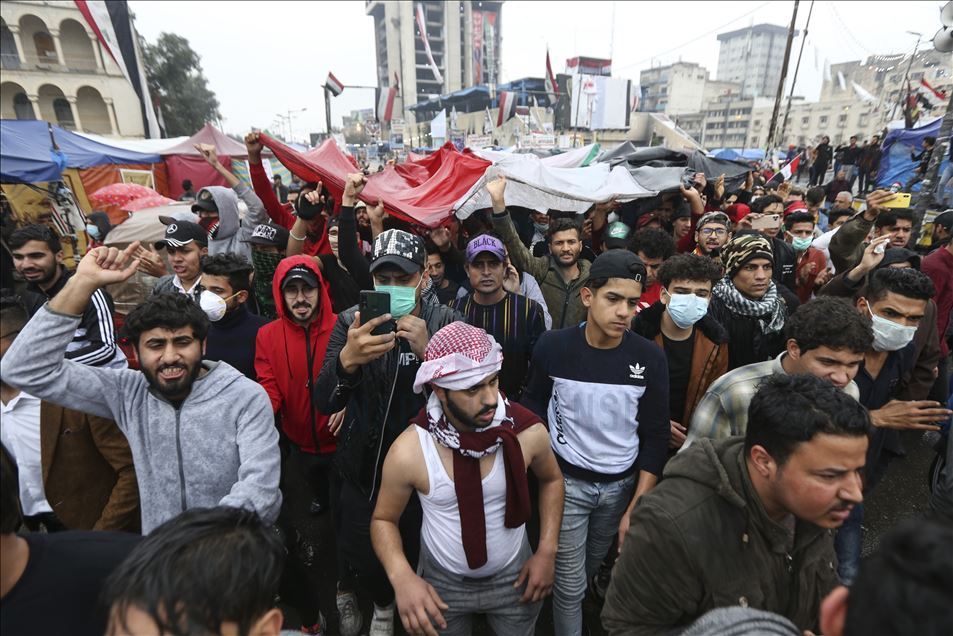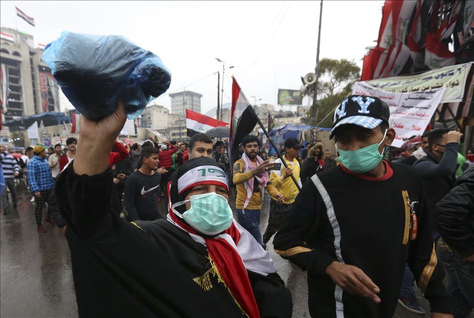 Iraqi demonstrators gather for anti-government protest at Tahrir Square in Baghdad, Iraq on February 25, 2020. Some demonstrators, wearing face masks, demand to increase precautions against coronavirus.