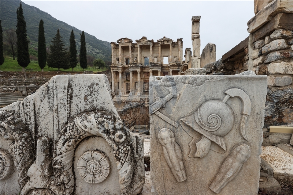 A view of the remains and Library of Celsus of Turkey’s iconic ancient city of Ephesus, in Izmir, Turkey on April 01, 2021. Ephesus was added to UNESCO’s prestigious World Heritage List in 2015. Ephesus, previously an ancient Greek city, and later a major Roman settlement near present-day Selcuk in the coastal Izmir province, boasts a rich cultural heritage dating back to 6,500 BC.