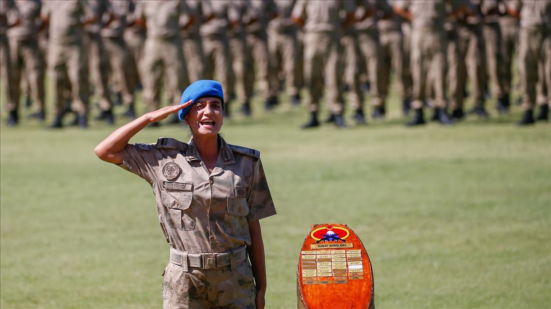 Turkish officer candidates perform during a ceremony at Foca Gendarmerie Commando School and Training Center Command after 492 officer candidates including 50 women completed commando basic training course in Izmir, Turkey on June 28, 2019.