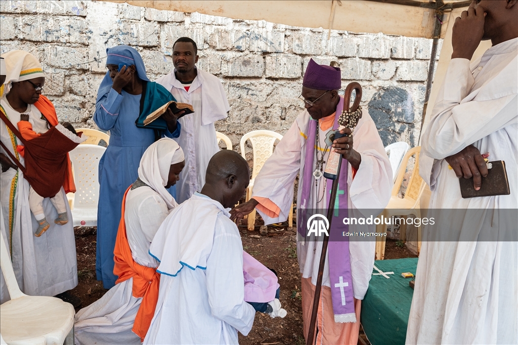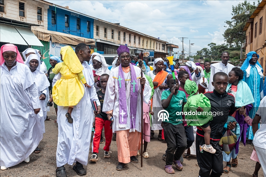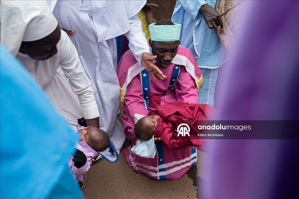 NAIROBI, KENYA - DECEMBER 14: Members of the Africa Roho Msalaba church take part in a traditional “baby tossing” ritual to introduce their infants to the congregation in Kibera, a slum area of Nairobi, Kenya’s capital on December 14, 2025. Babies are not taken outside the home or shown to strangers until they are two months old, after which they are presented to the community by being carried through the streets during the ritual. ( Edwin Nyamasyo - Anadolu Agency )Edwin Nyamasyo