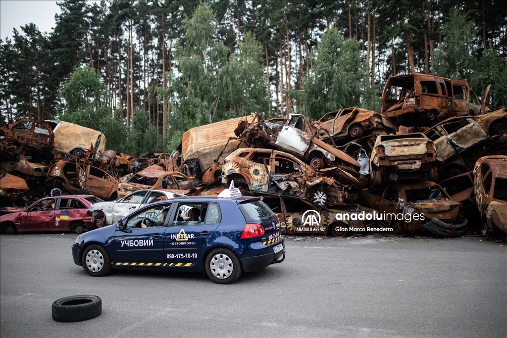 KYIV OBLAST, UKRAINE - JULY 27: A car passes by a pile of burnt down cars amid Russia and Ukraine war in Kyiv Oblast, Ukraine on July 27, 2023. While the war between Russia and Ukraine continues, some companies to invite tourists to visit Ukraine and see what it is like to live in the midst of war through war tourism. War tourism, which is a controversial issue in the country, is considered by some to be disrespectful to the victims of war, while others believe that it is important to remember history and learn from it. ( Gian Marco Benedetto - Anadolu Agency )Gian Marco Benedetto