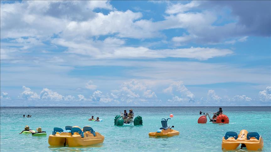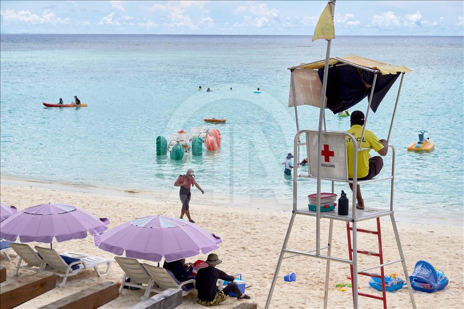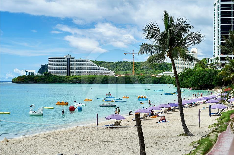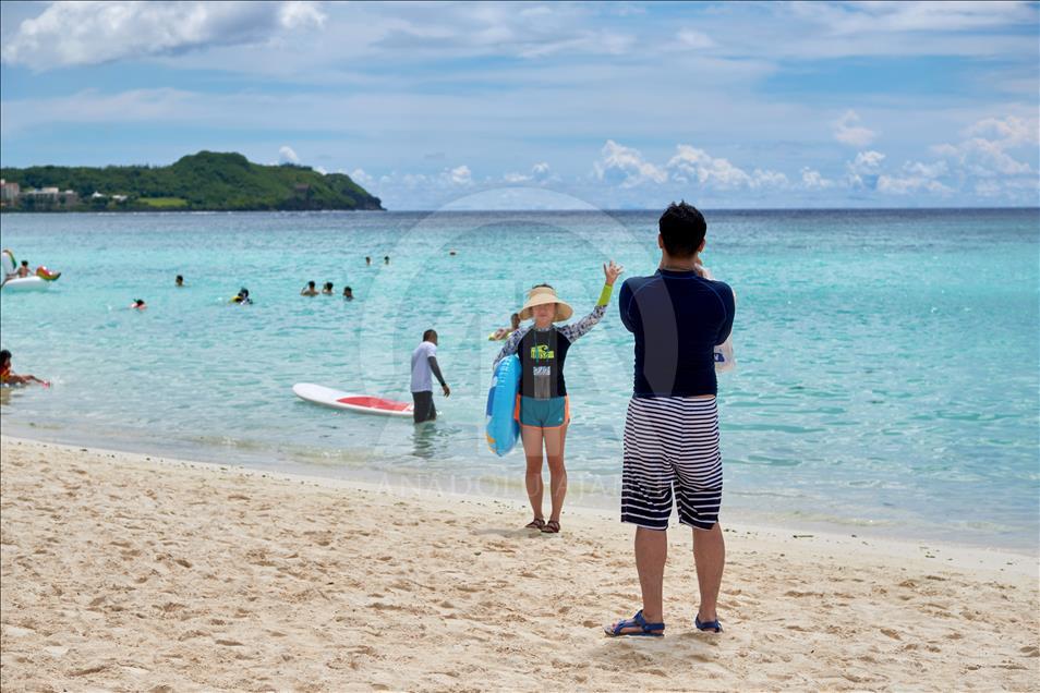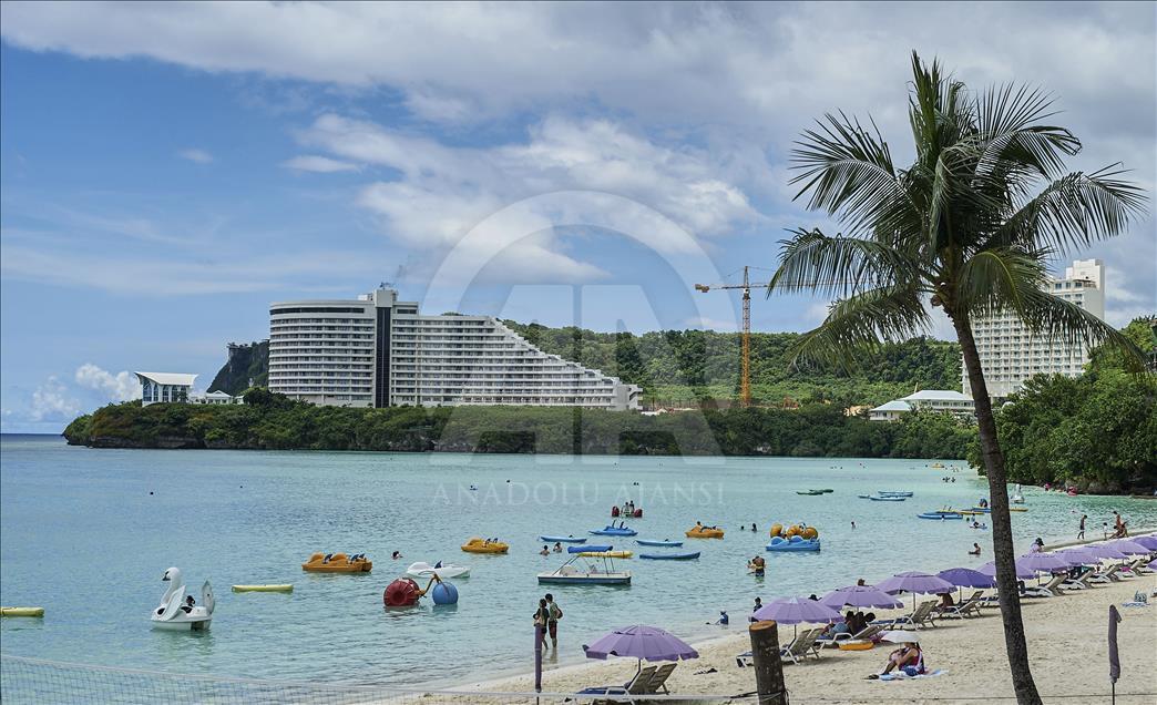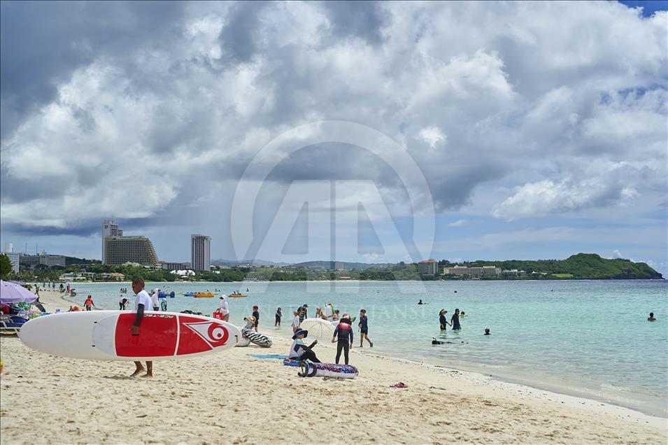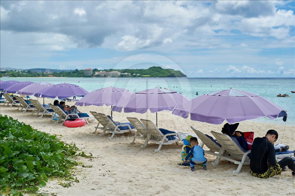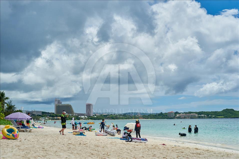 TUMON, GUAM - AUGUST 16: People, mostly include tourists, enjoy the sun, sea and the beach on Tumon Bay in Tumon, Guam on August 16, 2017. With the threat of missiles from North Korea the number of tourists have dropped slightly, and while the rest of the world is uneasy, island residents continue on with their daily lives. Henri Oftana