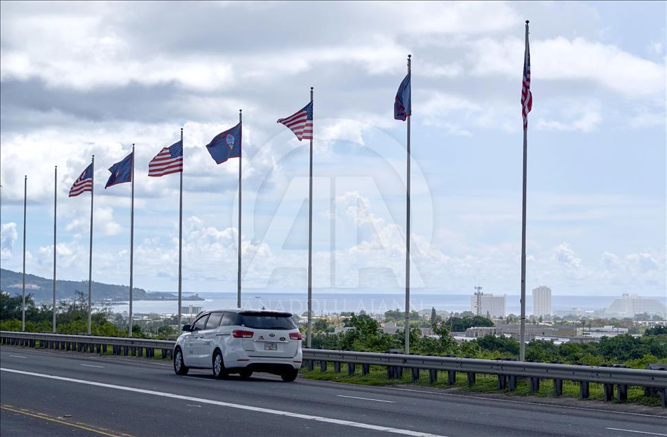 TUMON, GUAM - AUGUST 16: US and Guam national flags are seen in Tumon, Guam on August 16, 2017. With the threat of missiles from North Korea the number of tourists have dropped slightly, and while the rest of the world is uneasy, island residents continue on with their daily lives.Henri Oftana