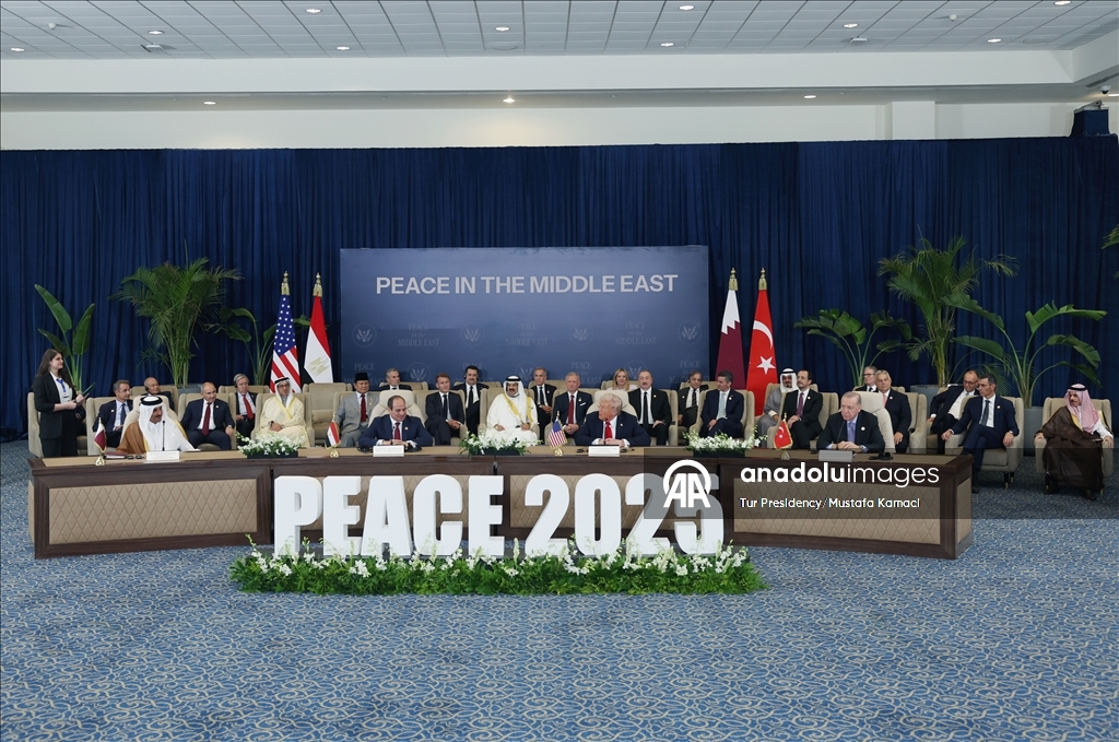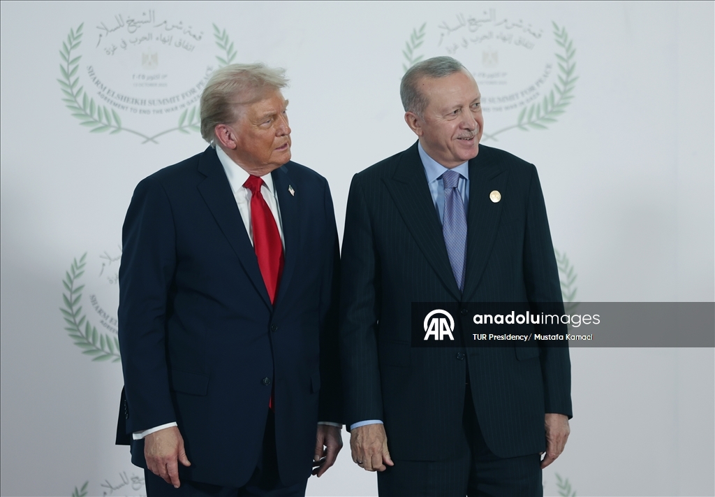 SHARM EL-SHEIKH, EGYPT - OCTOBER 13: (----EDITORIAL USE ONLY – MANDATORY CREDIT - 'TURKISH PRESIDENCY / MUSTAFA KAMACI / HANDOUT' - NO MARKETING NO ADVERTISING CAMPAIGNS - DISTRIBUTED AS A SERVICE TO CLIENTS----) Turkish President Recep Tayyip Erdogan (R) and US President Donald Trump (R-2), Egyptian President Abdel Fattah el-Sisi (L-2) and Emir of Qatar Sheikh Tamim bin Hamad Al Thani (L) attend the Sharm El-Sheikh Peace Summit in Sharm El-Sheikh, Egypt on October 13, 2025. ( Tur Presidency/Mustafa Kamaci - Anadolu Agency )Tur Presidency/Mustafa Kamaci
