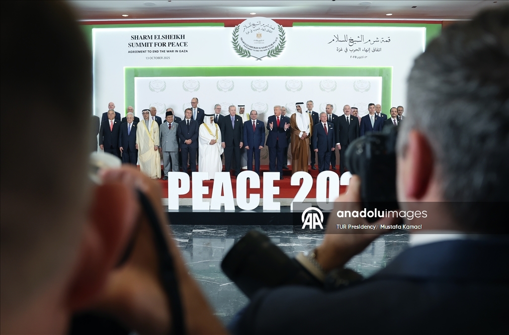 SHARM EL-SHEIKH, EGYPT - OCTOBER 13: (----EDITORIAL USE ONLY – MANDATORY CREDIT - 'TURKISH PRESIDENCY / MUSTAFA KAMACI / HANDOUT' - NO MARKETING NO ADVERTISING CAMPAIGNS - DISTRIBUTED AS A SERVICE TO CLIENTS----) World leaders pose for a family photo ahead of the Sharm El-Sheikh Peace Summit in Sharm El-Sheikh, Egypt on October 13, 2025. ( TUR Presidency/ Mustafa Kamaci - Anadolu Agency )TUR Presidency/ Mustafa Kamaci