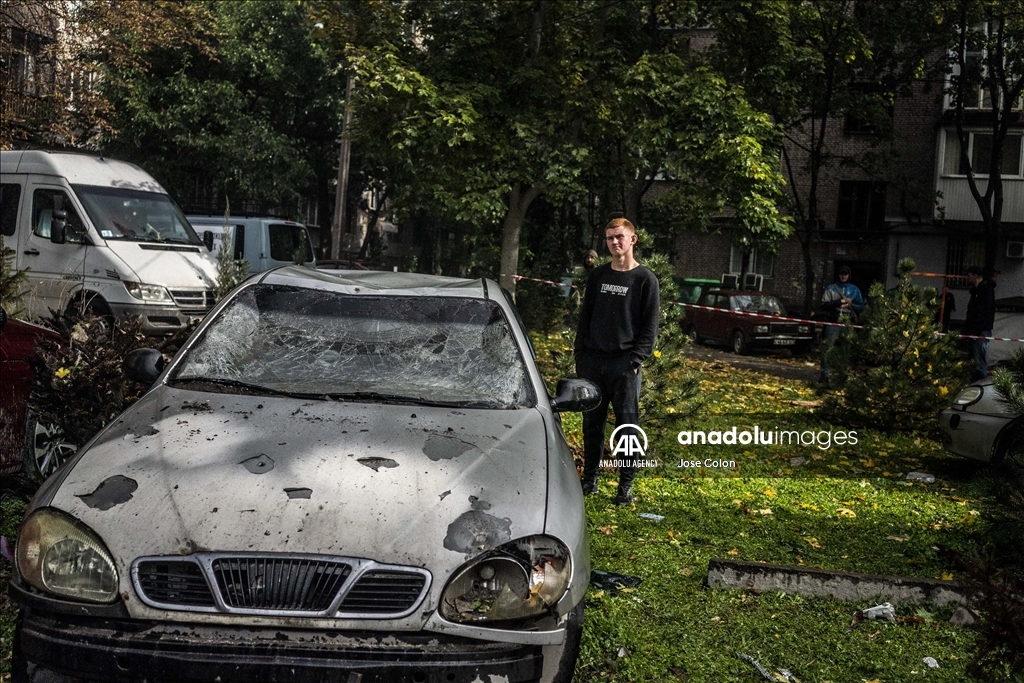 ZAPORIZHZHIA, UKRAINE - OCTOBER 10: A damaged car and a man are seen at a residential area after Russian missile attack in Zaporizhzhia, Ukraine on October 10, 2022. Today, the head of the city's military administration Oleksandr Starukh, reported to the Ukrinform Ukrainian news agency that a multi-storey building was destroyed as a result of a new rocket attack on the city center of Zaporizhzhia. ( Jose Colon - Anadolu Agency )Jose Colon