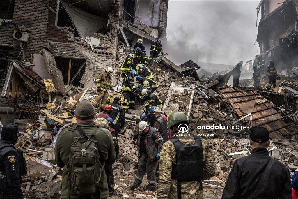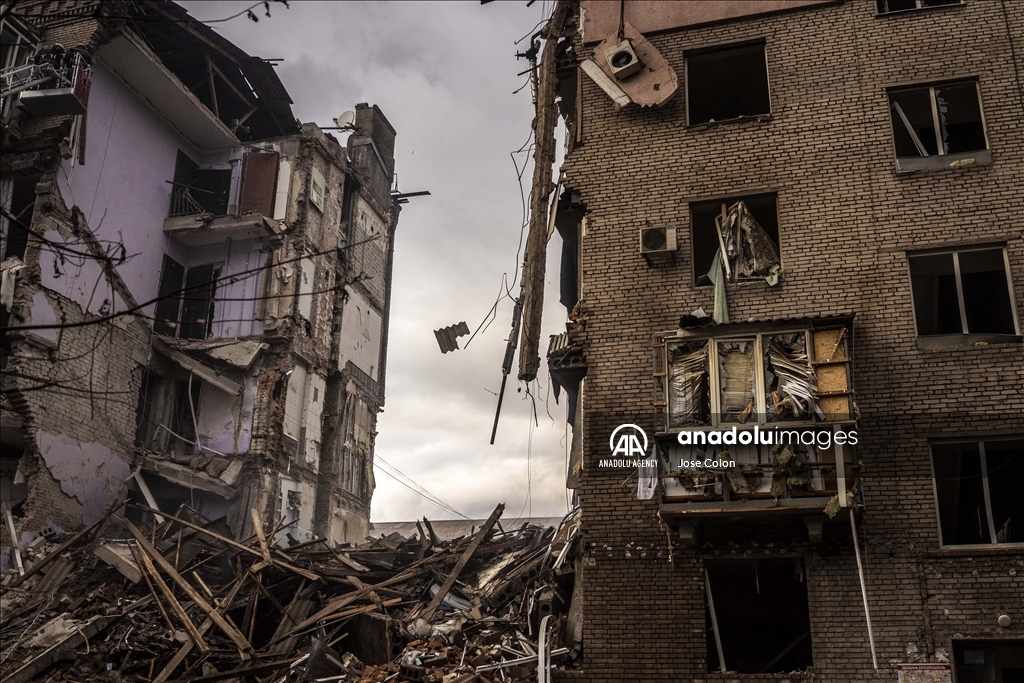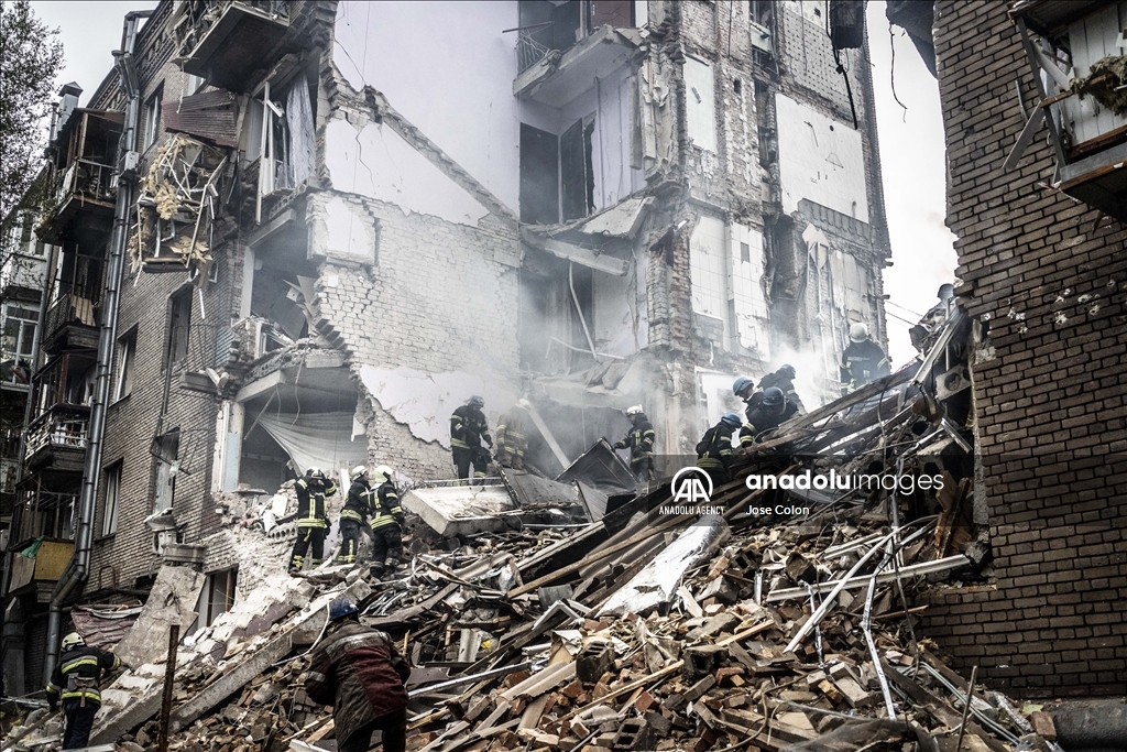 ZAPORIZHZHIA, UKRAINE - OCTOBER 10: A view of the destroyed buildings after Russian missile attack in Zaporizhzhia, Ukraine on October 10, 2022. Today, the head of the city's military administration Oleksandr Starukh, reported to the Ukrinform Ukrainian news agency that a multi-storey building was destroyed as a result of a new rocket attack on the city center of Zaporizhzhia. ( Jose Colon - Anadolu Agency )Jose Colon