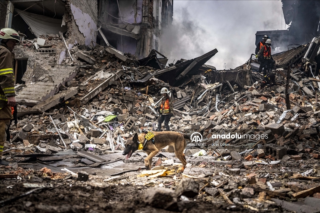 ZAPORIZHZHIA, UKRAINE - OCTOBER 10: A search and rescue dog is seen during firefighters conduct work in a damaged building after Russian missile attack in Zaporizhzhia, Ukraine on October 10, 2022. Today, the head of the city's military administration Oleksandr Starukh, reported to the Ukrinform Ukrainian news agency that a multi-storey building was destroyed as a result of a new rocket attack on the city center of Zaporizhzhia. ( Jose Colon - Anadolu Agency )Jose Colon