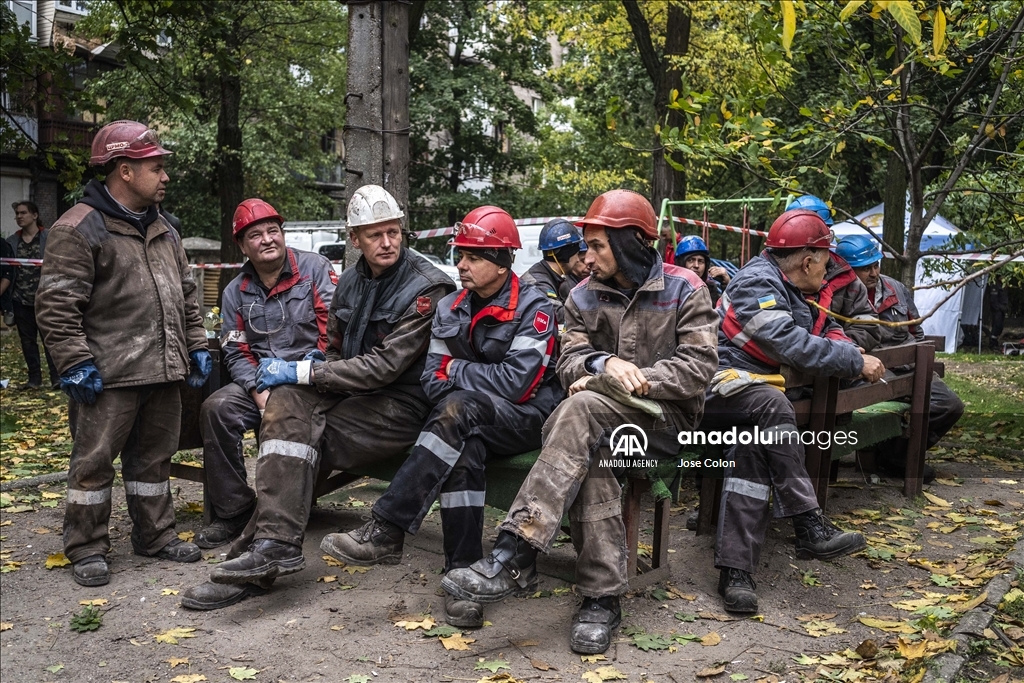 ZAPORIZHZHIA, UKRAINE - OCTOBER 10: A group of firefighters rest in the damaged area after Russian missile attack in Zaporizhzhia, Ukraine on October 10, 2022. Today, the head of the city's military administration Oleksandr Starukh, reported to the Ukrinform Ukrainian news agency that a multi-storey building was destroyed as a result of a new rocket attack on the city center of Zaporizhzhia. ( Jose Colon - Anadolu Agency )Jose Colon