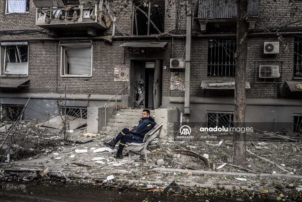 ZAPORIZHZHIA, UKRAINE - OCTOBER 10: A firefighter sits in front of the damaged building after Russian missile attack in Zaporizhzhia, Ukraine on October 10, 2022. Today, the head of the city's military administration Oleksandr Starukh, reported to the Ukrinform Ukrainian news agency that a multi-storey building was destroyed as a result of a new rocket attack on the city center of Zaporizhzhia. ( Jose Colon - Anadolu Agency )Jose Colon
