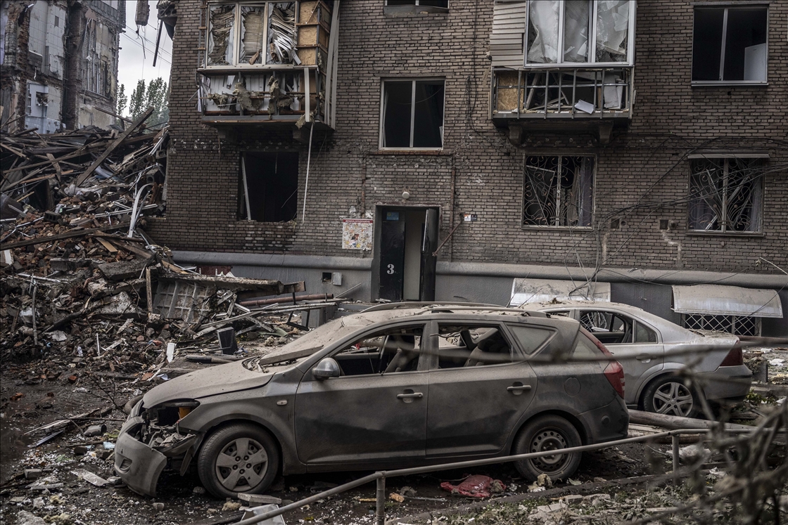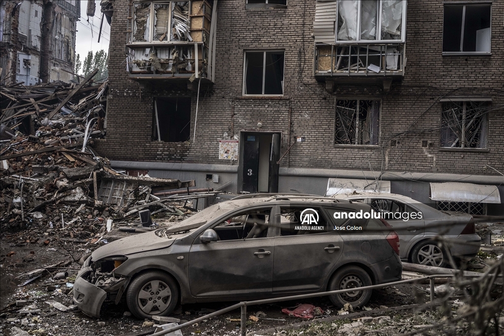 ZAPORIZHZHIA, UKRAINE - OCTOBER 10: Damaged cars and destroyed buildings are seen at a residential area after Russian missile attack in Zaporizhzhia, Ukraine on October 10, 2022. Today, the head of the city's military administration Oleksandr Starukh, reported to the Ukrinform Ukrainian news agency that a multi-storey building was destroyed as a result of a new rocket attack on the city center of Zaporizhzhia. ( Jose Colon - Anadolu Agency )Jose Colon