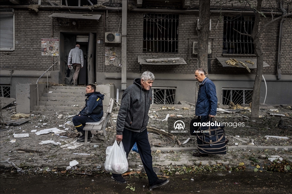 ZAPORIZHZHIA, UKRAINE - OCTOBER 10: Citizens are seen in front of the damaged building after Russian missile attack in Zaporizhzhia, Ukraine on October 10, 2022. Today, the head of the city's military administration Oleksandr Starukh, reported to the Ukrinform Ukrainian news agency that a multi-storey building was destroyed as a result of a new rocket attack on the city center of Zaporizhzhia. ( Jose Colon - Anadolu Agency )Jose Colon