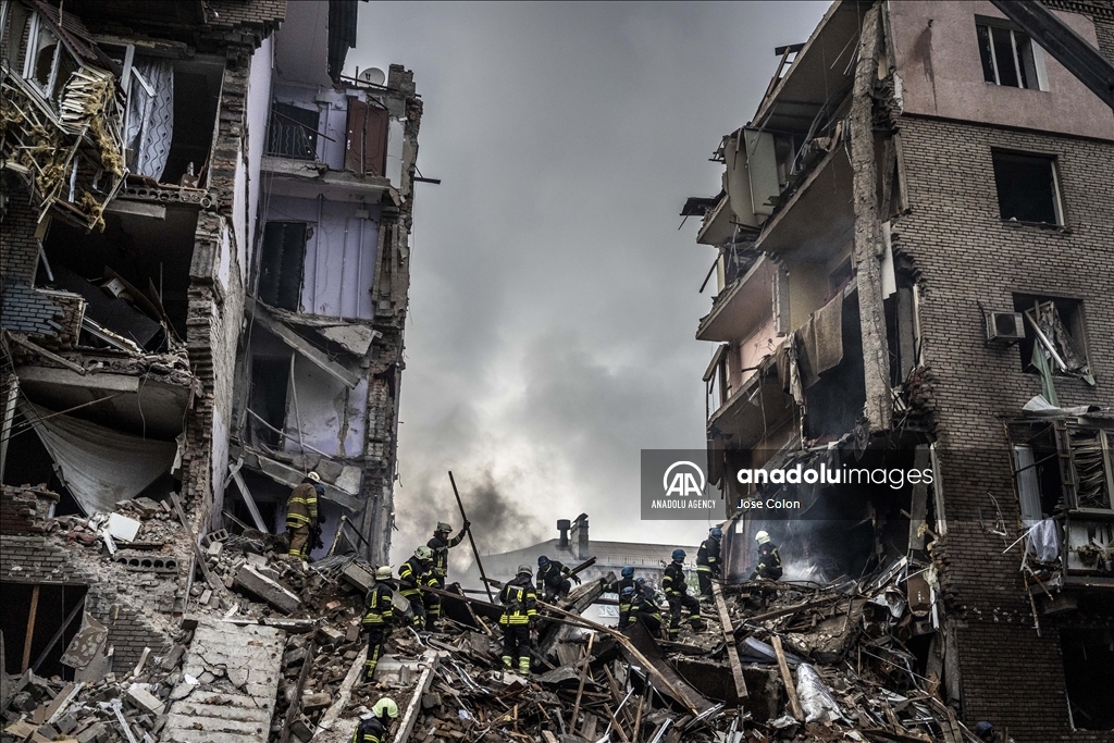 ZAPORIZHZHIA, UKRAINE - OCTOBER 10: Firefighters conduct work in a damaged building after Russian missile attack in Zaporizhzhia, Ukraine on October 10, 2022. Today, the head of the city's military administration Oleksandr Starukh, reported to the Ukrinform Ukrainian news agency that a multi-storey building was destroyed as a result of a new rocket attack on the city center of Zaporizhzhia. ( Jose Colon - Anadolu Agency )Jose Colon
