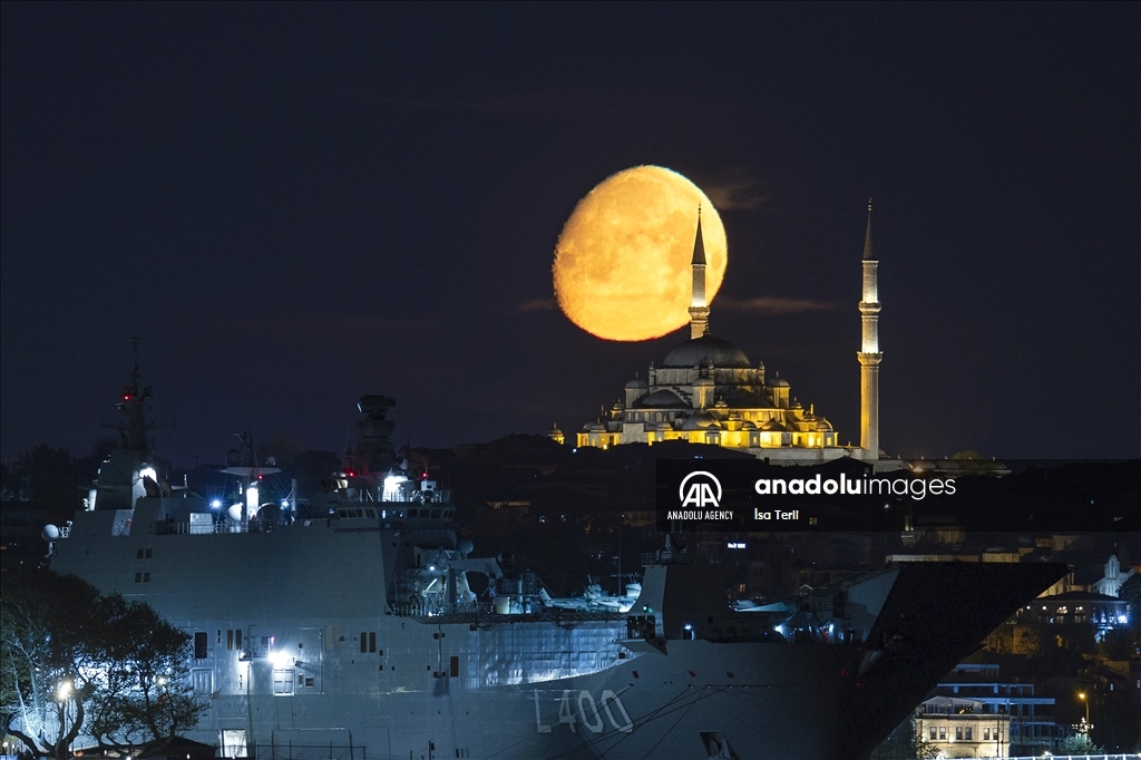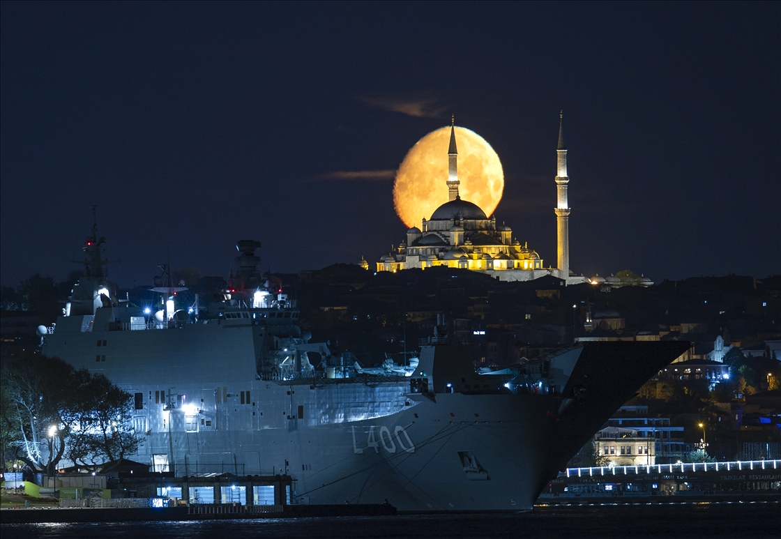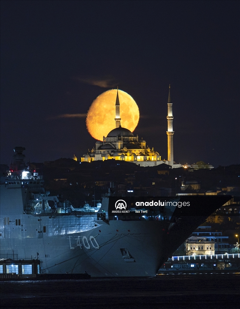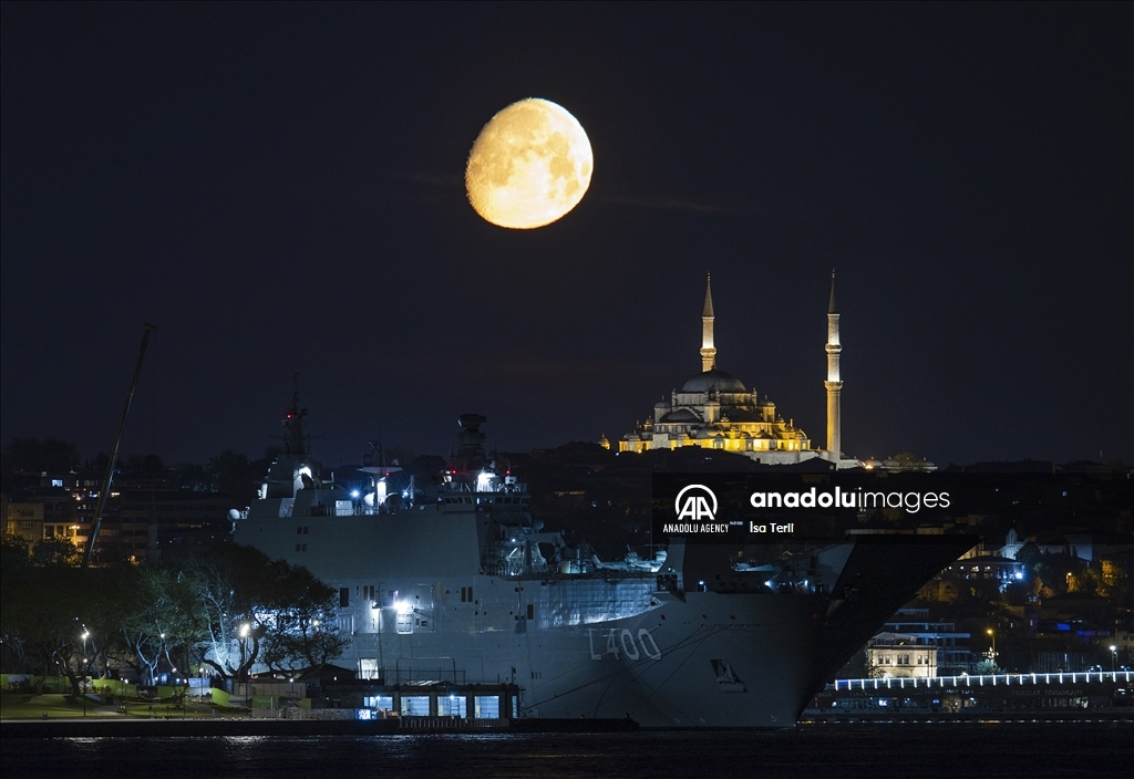 Moon appears over TCG Anadolu, Turkiye's largest warship and the world's first unmanned combat aerial vehicle (UCAV) carrier and Fatih Mosque in Istanbul, Turkiye