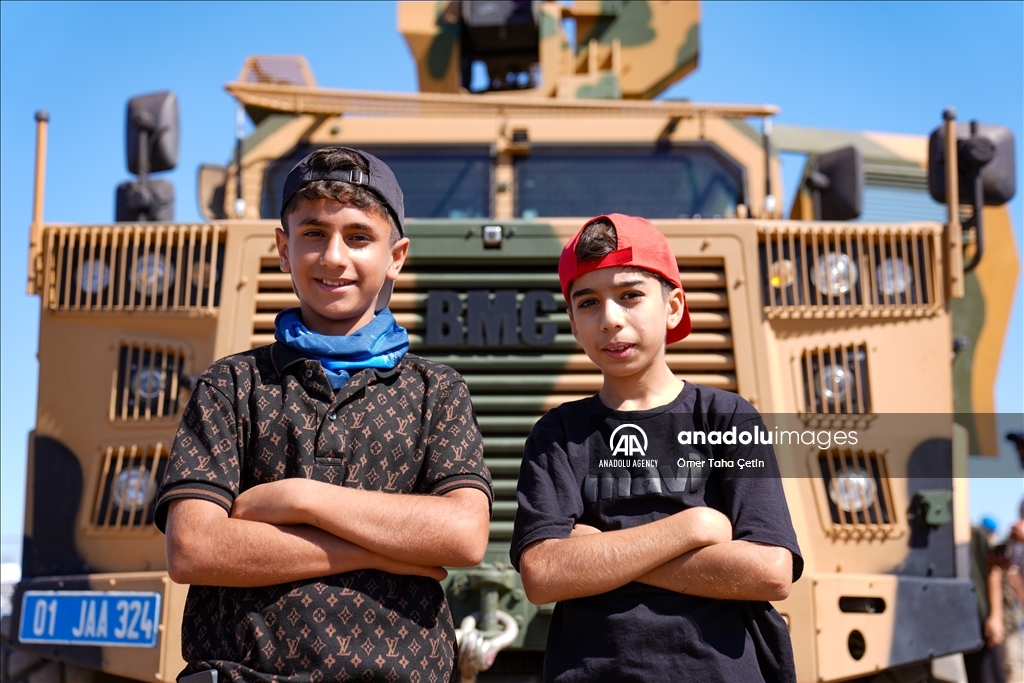 ADANA, TURKIYE - OCTOBER 03: Children pose for a photo in front of the moving land vehicle on display on the second day of Turkiye's premier technology and aerospace event TEKNOFEST, held at Adana Airport in Adana, Turkiye on October 03, 2024. The four-day event will feature competitions, air shows, exhibitions and workshops. The event has been organized by the Turkish Technology Team (T3) Foundation and the Turkish Industry and Technology Ministry jointly since 2018, in cooperation with dozens of ministries, public institutions, private firms, and universities. ( Ömer Taha Çetin - Anadolu Agency )Ömer Taha Çetin