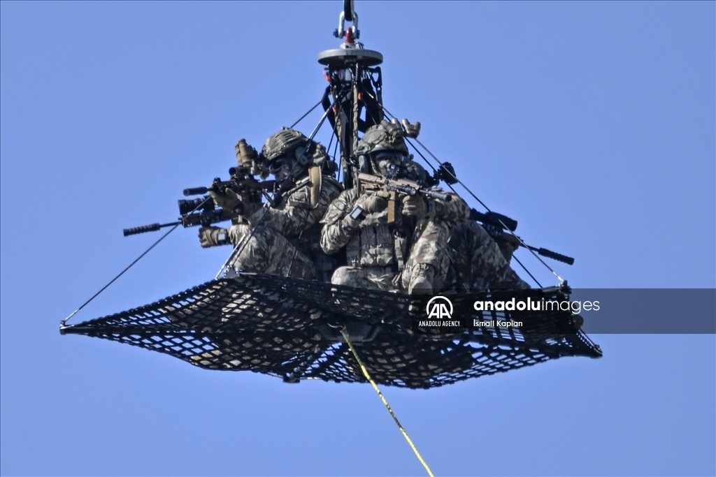 ADANA, TURKIYE - OCTOBER 3: Turkish special forces team performed an aerial evacuation demonstration, on the second day of Turkiye's premier technology and aerospace event TEKNOFEST, held at Adana Airport in Adana, Turkiye on October 3, 2024. The four-day event will feature competitions, air shows, exhibitions and workshops. The event has been organized by the Turkish Technology Team (T3) Foundation and the Turkish Industry and Technology Ministry jointly since 2018, in cooperation with dozens of ministries, public institutions, private firms, and universities. ( İsmail Kaplan - Anadolu Agency )İsmail Kaplan