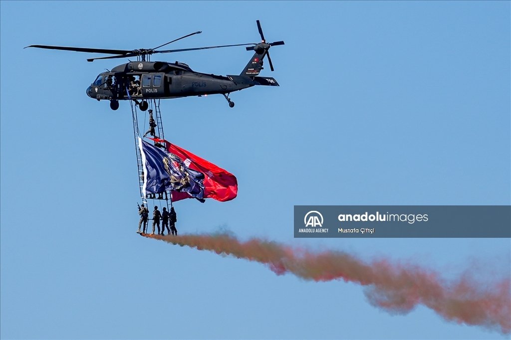 ADANA, TURKIYE - OCTOBER 3: Police Special Operations teams perform demonstration on the second day of Turkiye's premier technology and aerospace event TEKNOFEST, held at Adana Airport in Adana, Turkiye on October 3, 2024. The four-day event will feature competitions, air shows, exhibitions and workshops. The event has been organized by the Turkish Technology Team (T3) Foundation and the Turkish Industry and Technology Ministry jointly since 2018, in cooperation with dozens of ministries, public institutions, private firms, and universities. ( Mustafa Çiftçi - Anadolu Agency )Mustafa Çiftçi