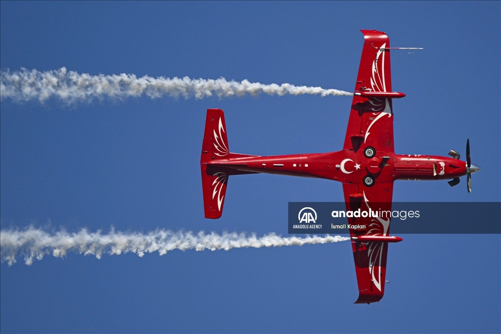 ADANA, TURKIYE - OCTOBER 3: HURKUS performs on the second day of Turkiye's premier technology and aerospace event TEKNOFEST, held at Adana Airport in Adana, Turkiye on October 3, 2024. The four-day event will feature competitions, air shows, exhibitions and workshops. The event has been organized by the Turkish Technology Team (T3) Foundation and the Turkish Industry and Technology Ministry jointly since 2018, in cooperation with dozens of ministries, public institutions, private firms, and universities. ( İsmail Kaplan - Anadolu Agency )İsmail Kaplan