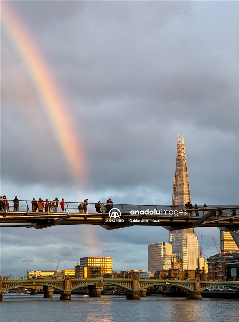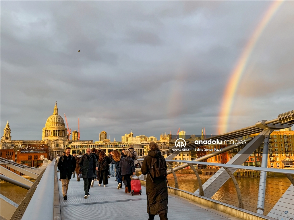 LONDON, UNITED KINGDOM - MARCH 05: A rainbow appears over the Millennium Bridge and Thames River in London, United Kingdom on March 05, 2024.