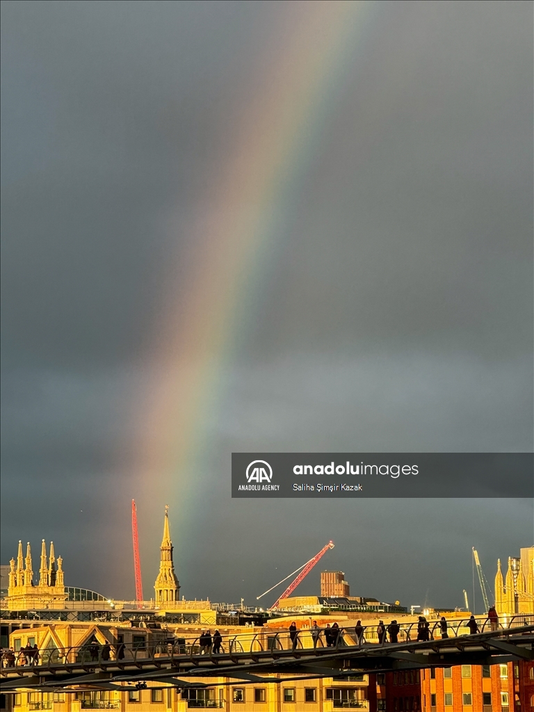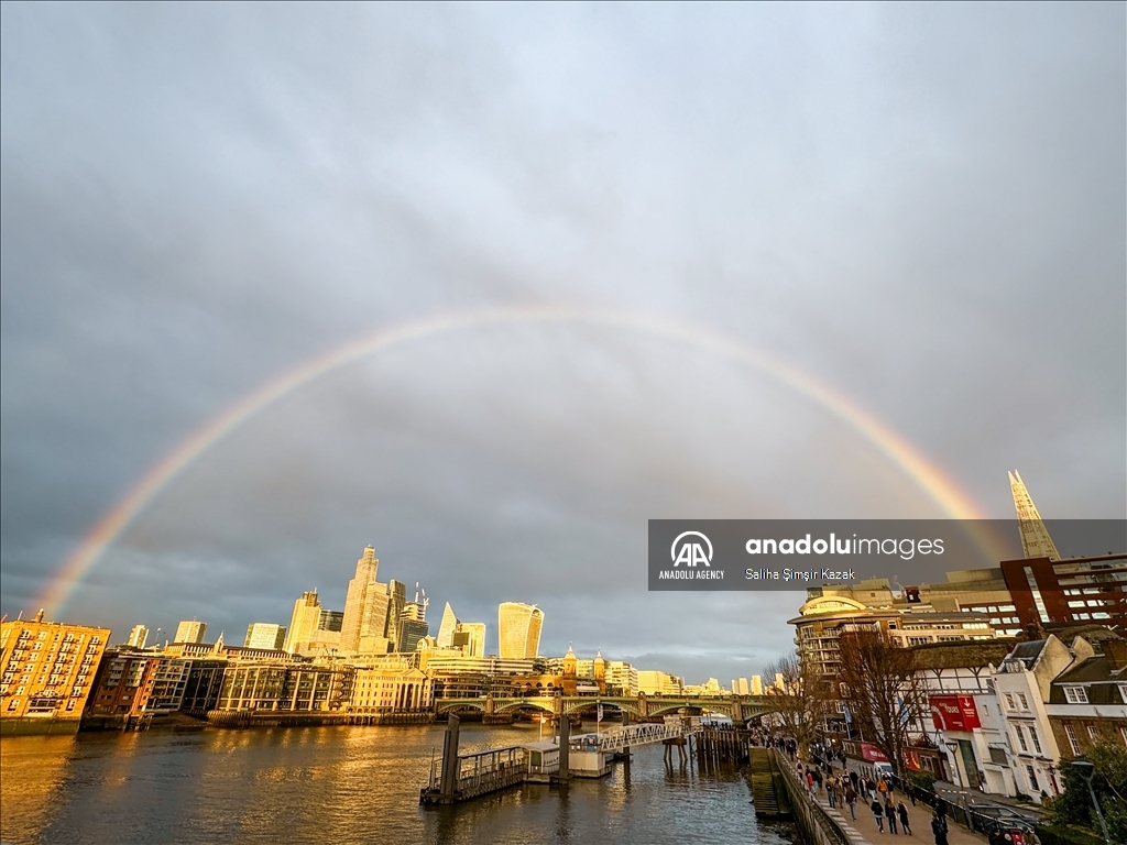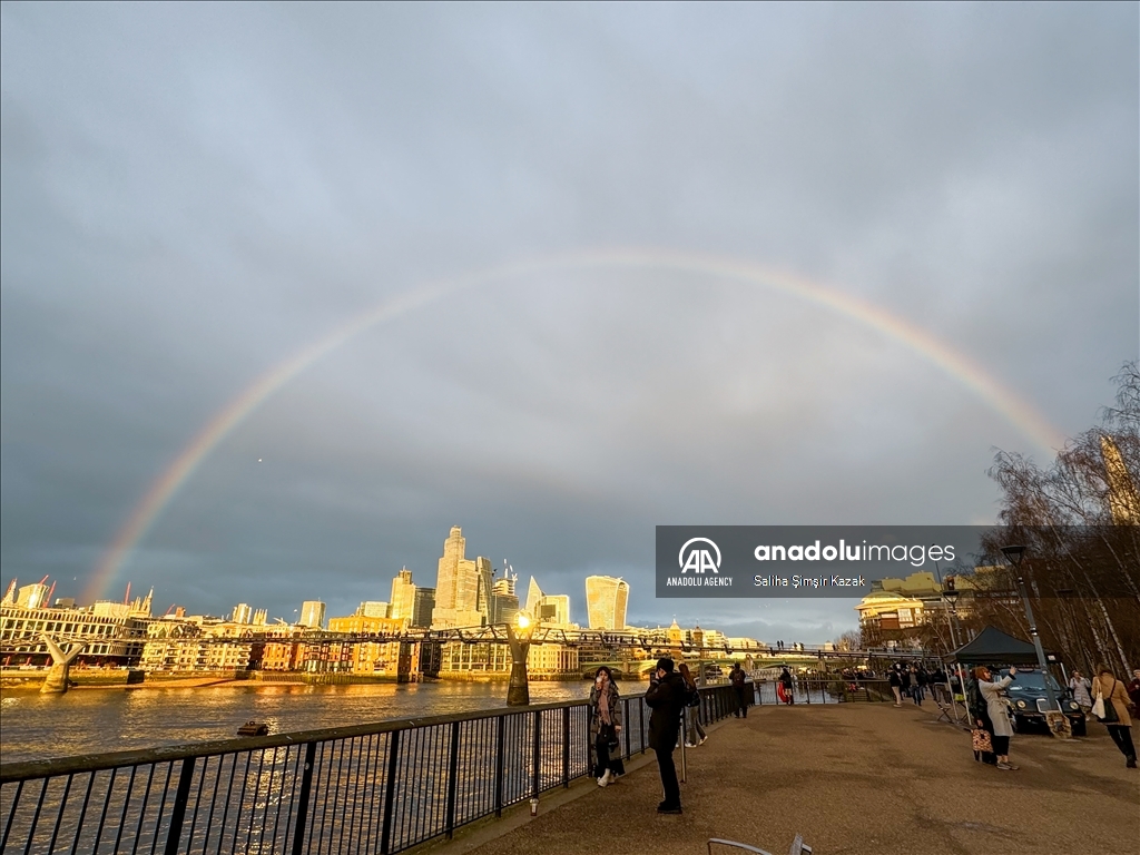 LONDON, UNITED KINGDOM - MARCH 05: A rainbow appears over the Thames River near St Paul Cathedral in London, United Kingdom on March 05, 2024.