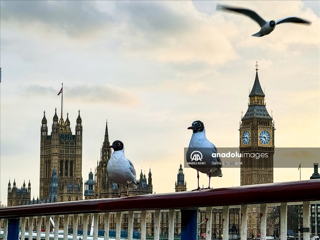 LONDON, UNITED KINGDOM - MARCH 05: Seagulls stand on a wall in front of Big Ben, the Houses of Parliament, the Palace of Westminster in London, United Kingdom on March 05, 2024.