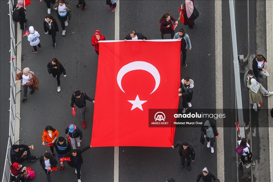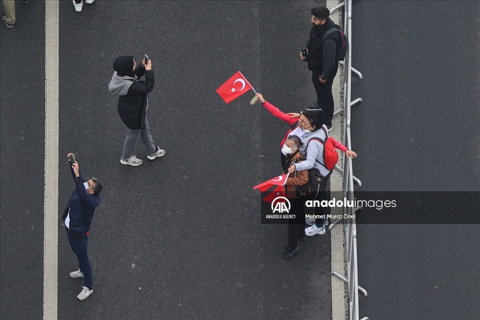 ISTANBUL, TURKEY - NOVEMBER 07: People crossing the July 15 Martyrs Bridge as they take part in the Istanbul Marathon on November 07, 2021 in Istanbul, Turkey. ( Elif Öztürk Özgöncü - Anadolu Agency )Elif Öztürk Özgöncü