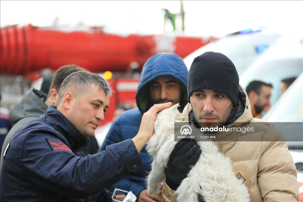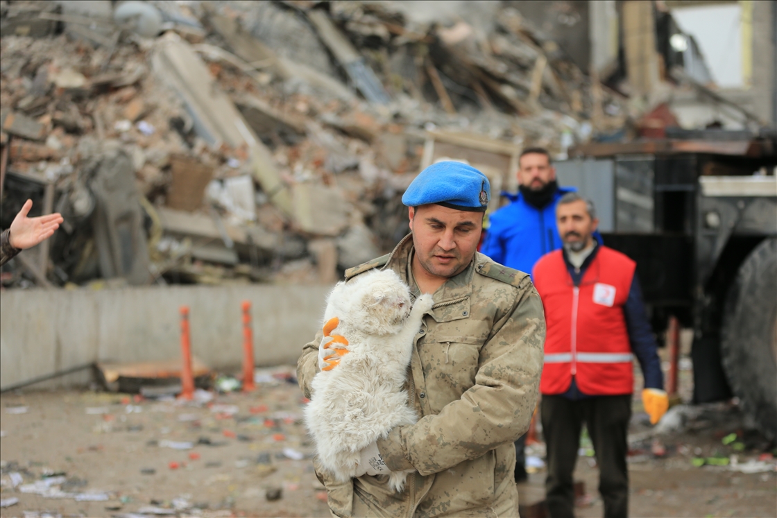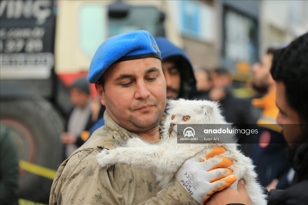 DIYARBAKIR, TURKIYE - FEBRUARY 06: Turkish gendarmerie rescued a cat under rubble of a Galeria Mall after a 7.4 magnitude earthquake hit Diyarbakir, Turkiye on February 06, 2023. The 7.4 magnitude earthquake jolted southern province of Kahramanmaras of Turkiye early Monday, according to Disaster and Emergency Management Authority of Turkiye (AFAD). It was followed by a magnitude 6.4 quake that struck southeastern Gaziantep province. A third earthquake with a 6.5 magnitude also hit Gaziantep. Earthquakes had affected several provinces including, Osmaniye, Malatya, Adiyaman, Adana, Diyarbakir, Kilis and Sanliurfa. ( Aydın Arik - Anadolu Agency )Aydın Arik