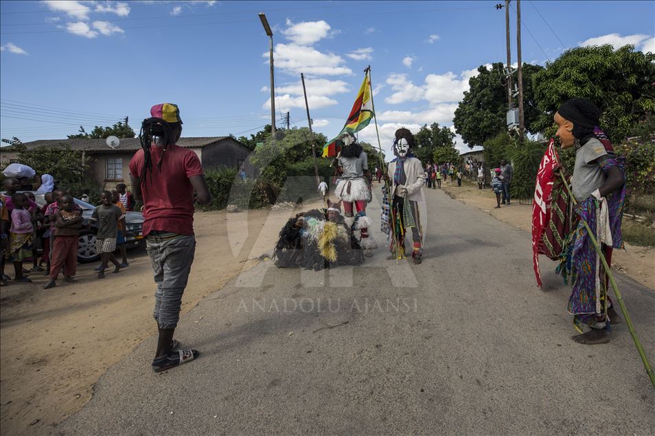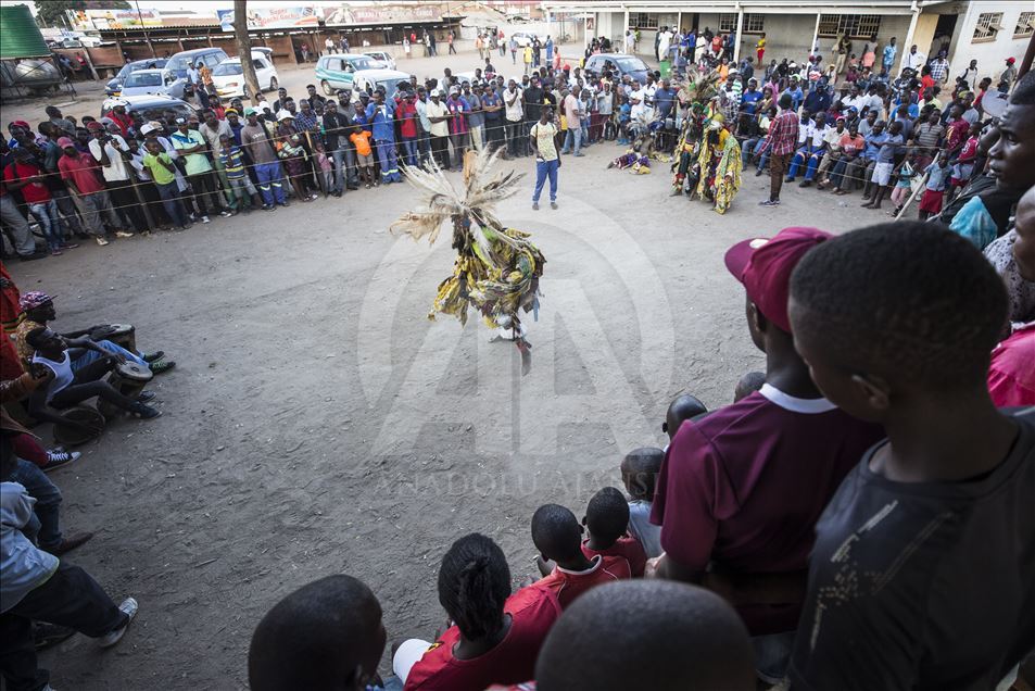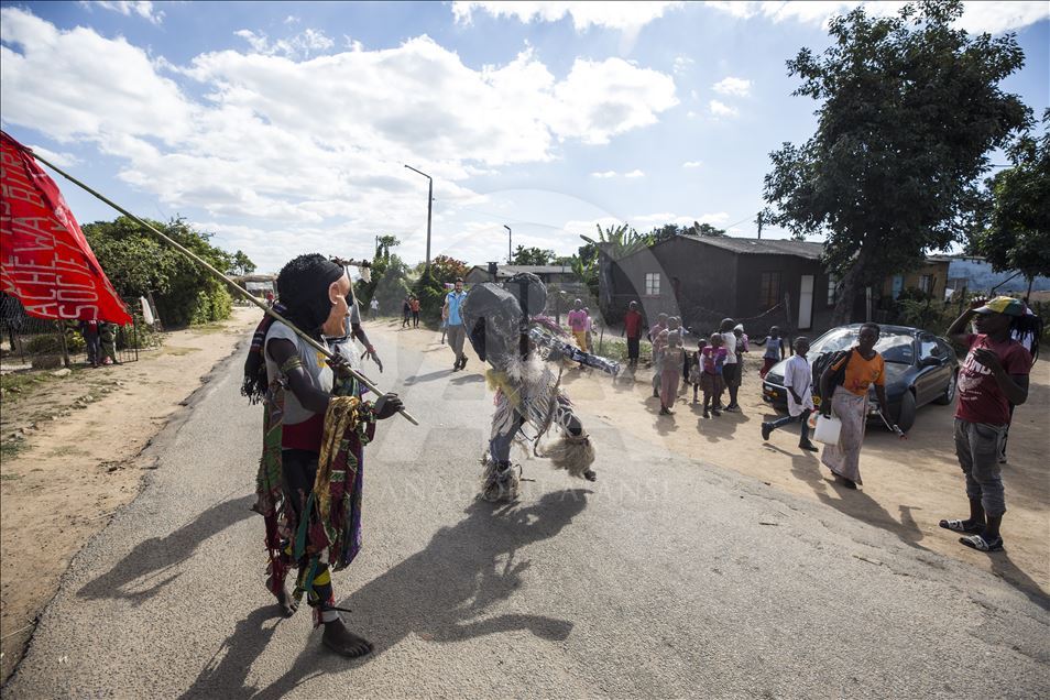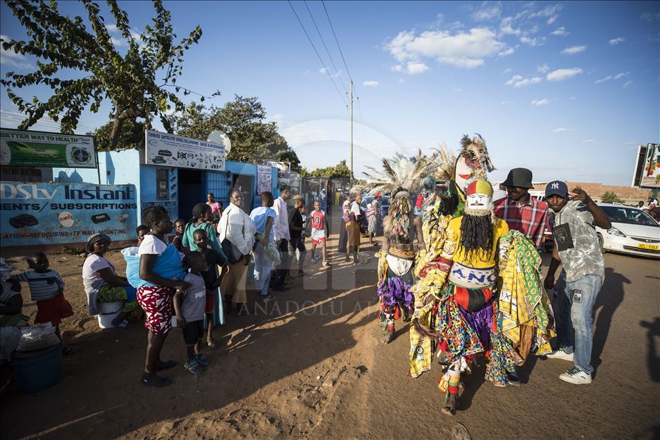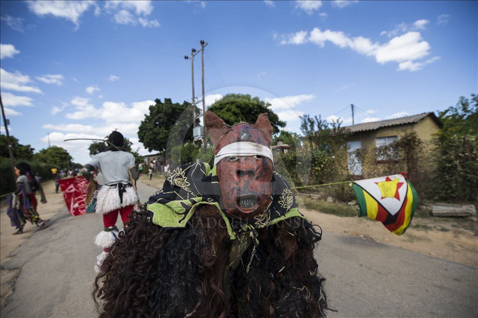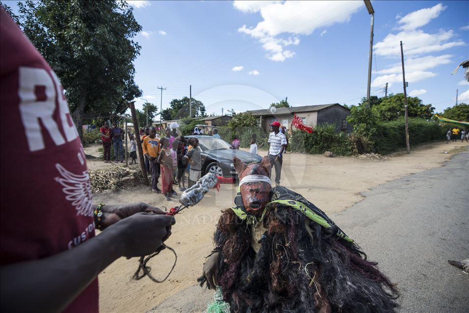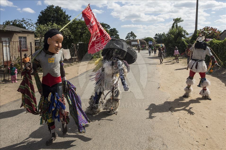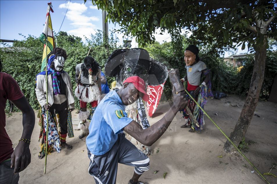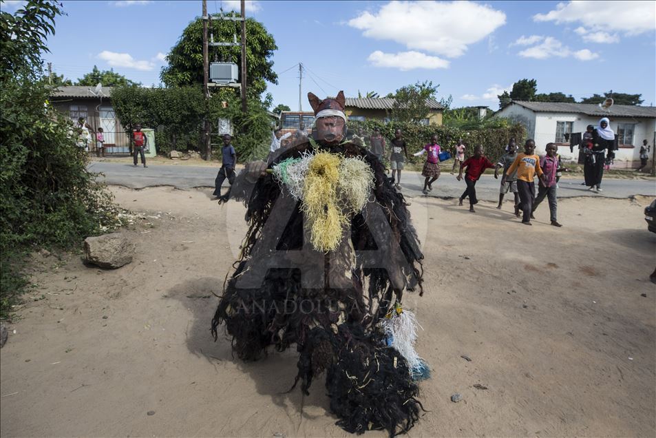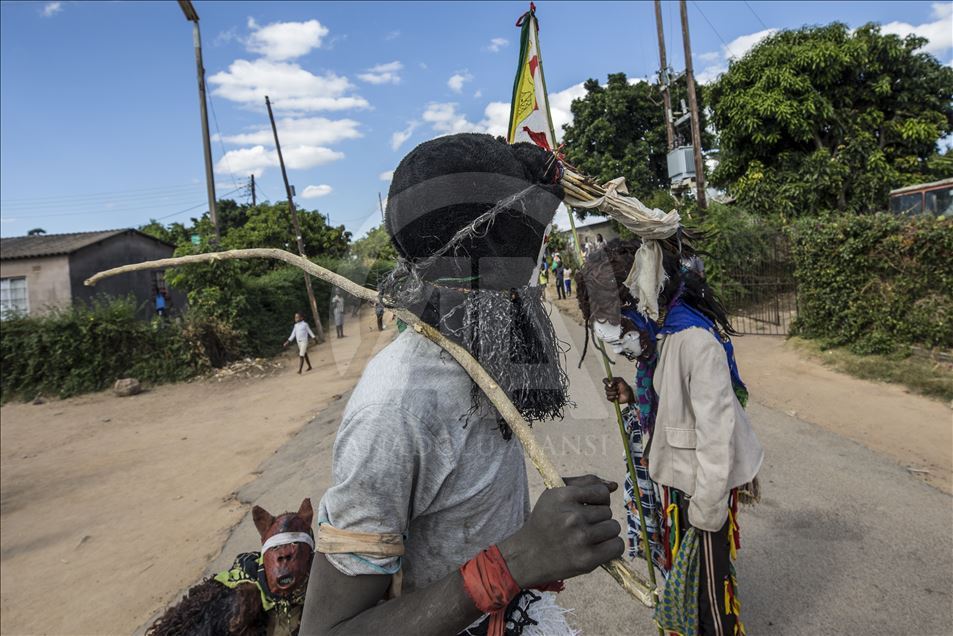 Members of Gure team, consisting of boys called as Cegure with ages ranging from 15 to 20, are seen with their masks and costumes in Harare, Zimbabwe on May 14, 2019. Gure culture of southern and central African countries continues also in Zimbabwe.