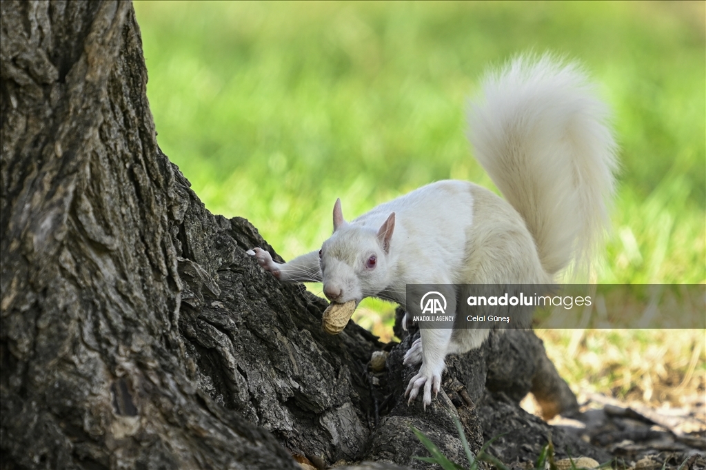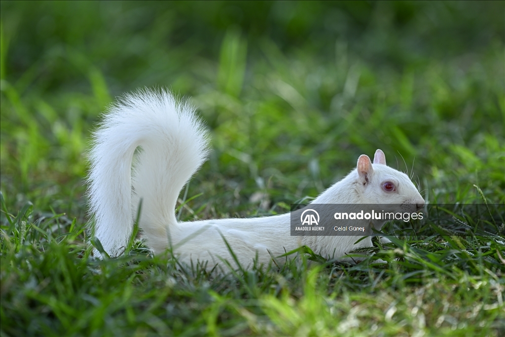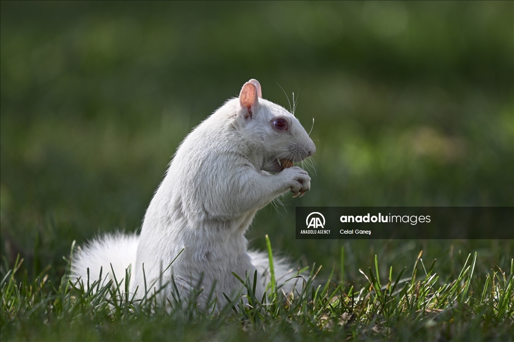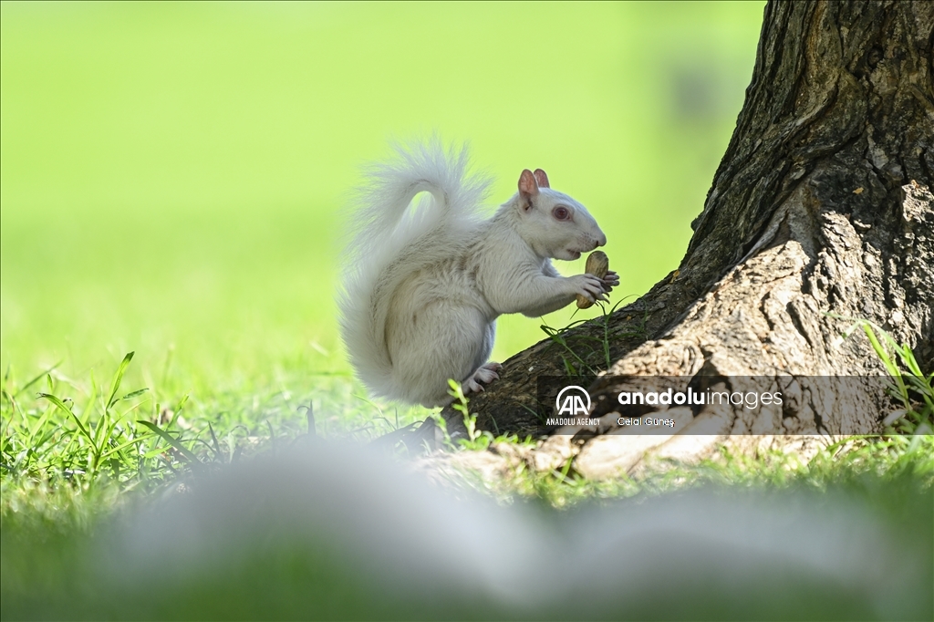 WASHINGTON D.C, UNITED STATES - SEPTEMBER 13: Albino squirrels, which are extremely rare in nature, are found in nature with their completely white fur at National Mall in Washington D.C., United States on September 13, 2023. Albinism is considered a genetic anomaly defined by the complete or partial absence of pigments. People living in or visiting the Capitol have the privilege of seeing these red-eyed albino or white squirrels, which are born with a 1 in 100,000 chance. According to scientists' estimates, in the United States, only 20 of the 2 million squirrel population are albinos. Experts warn that these unique creatures of nature should be protected in their environment and not fed by others. ( Celal Güneş - Anadolu Agency )