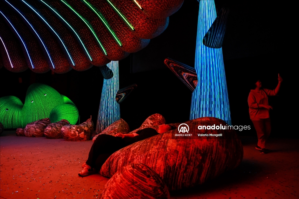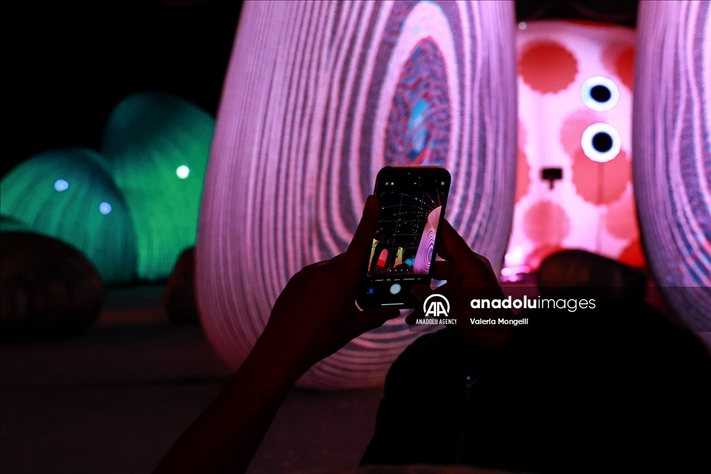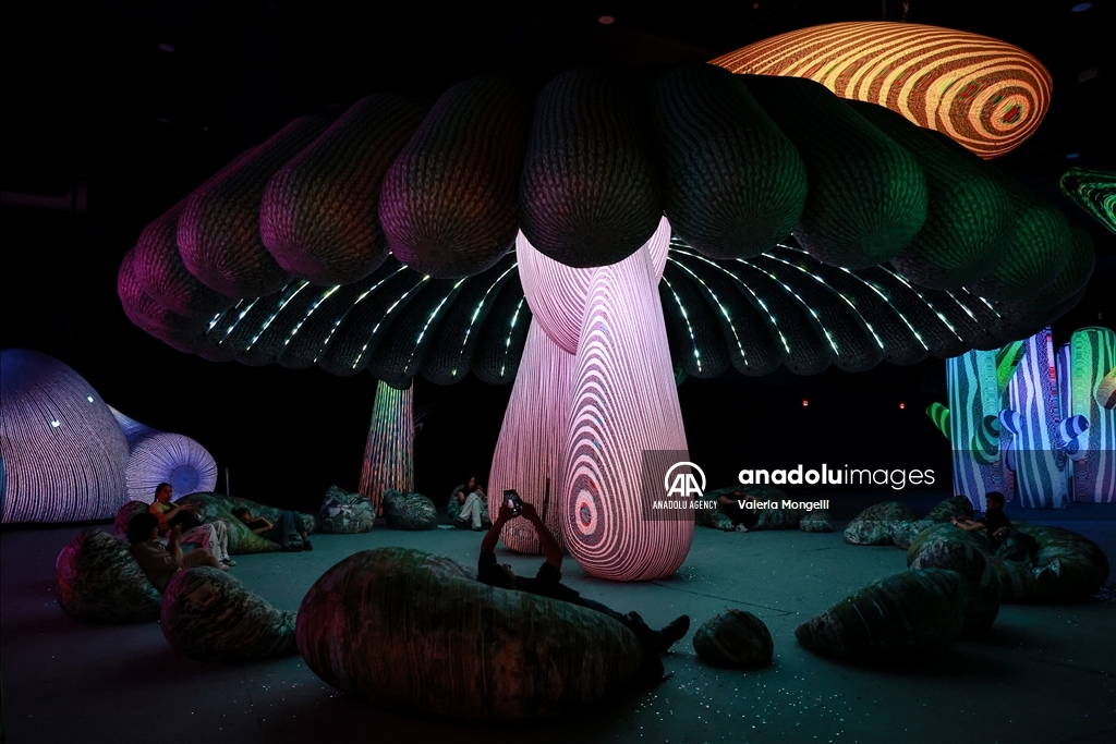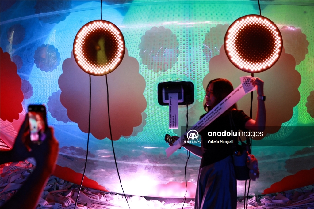 Visitors stand among artworks at the "Modern Guru and the Path to Artificial Happiness" exhibition at Iconsiam in Bangkok, Thailand on November 18, 2024. The exhibition, created by the Australian art studio Eness, blends creative artistry with integrated AI technology.