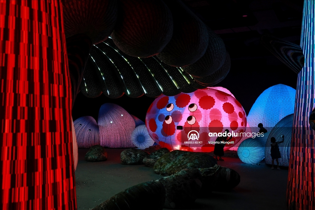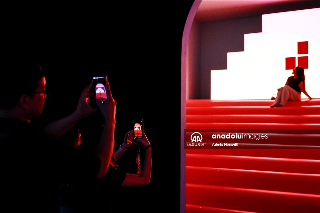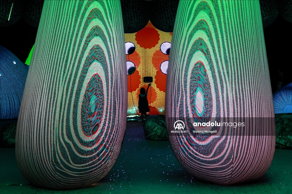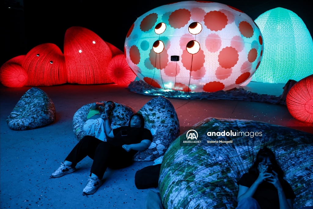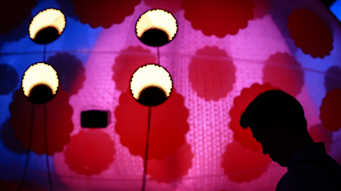Visitors stand among artworks at the "Modern Guru and the Path to Artificial Happiness" exhibition at Iconsiam in Bangkok, Thailand on November 18, 2024. The exhibition, created by the Australian art studio Eness, blends creative artistry with integrated AI technology.