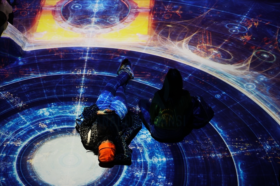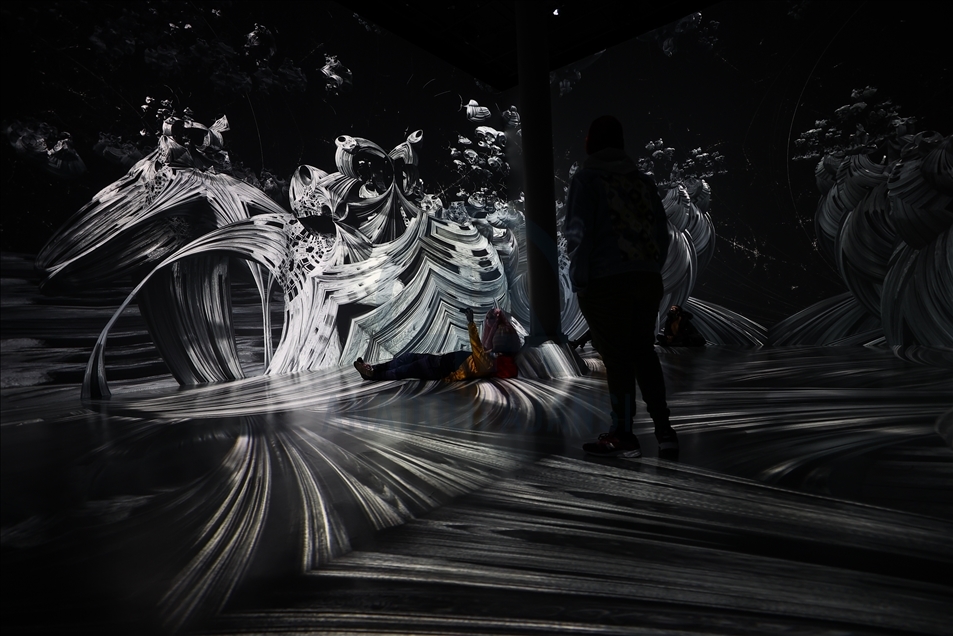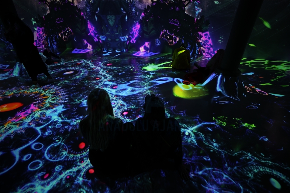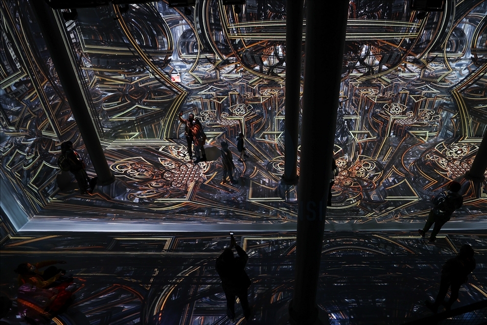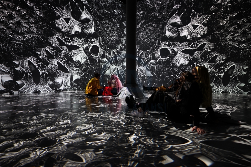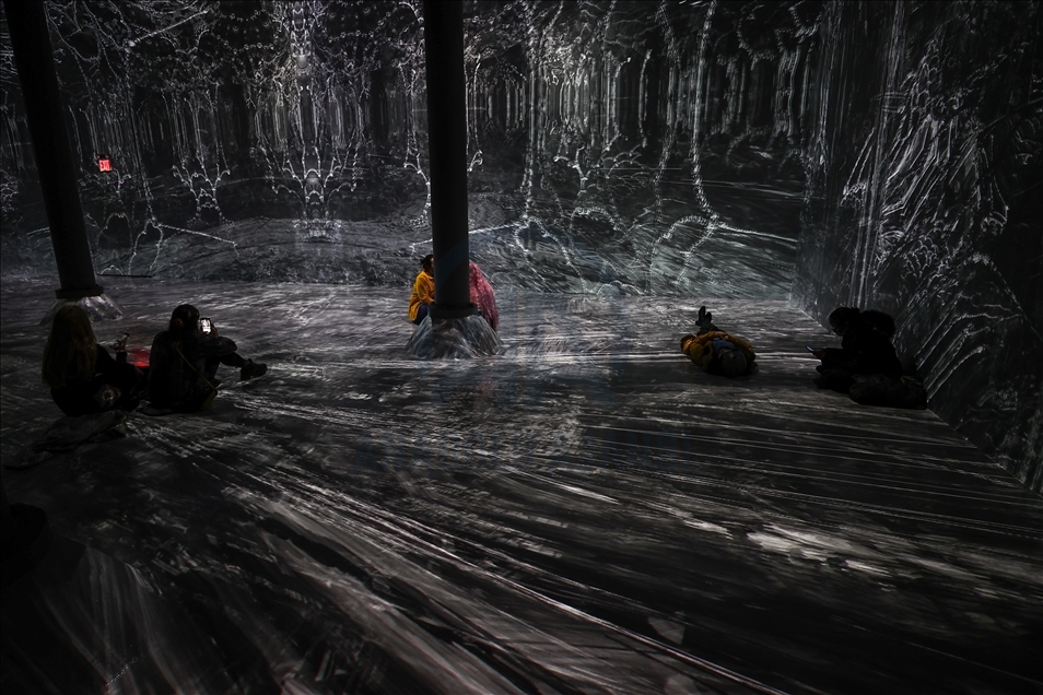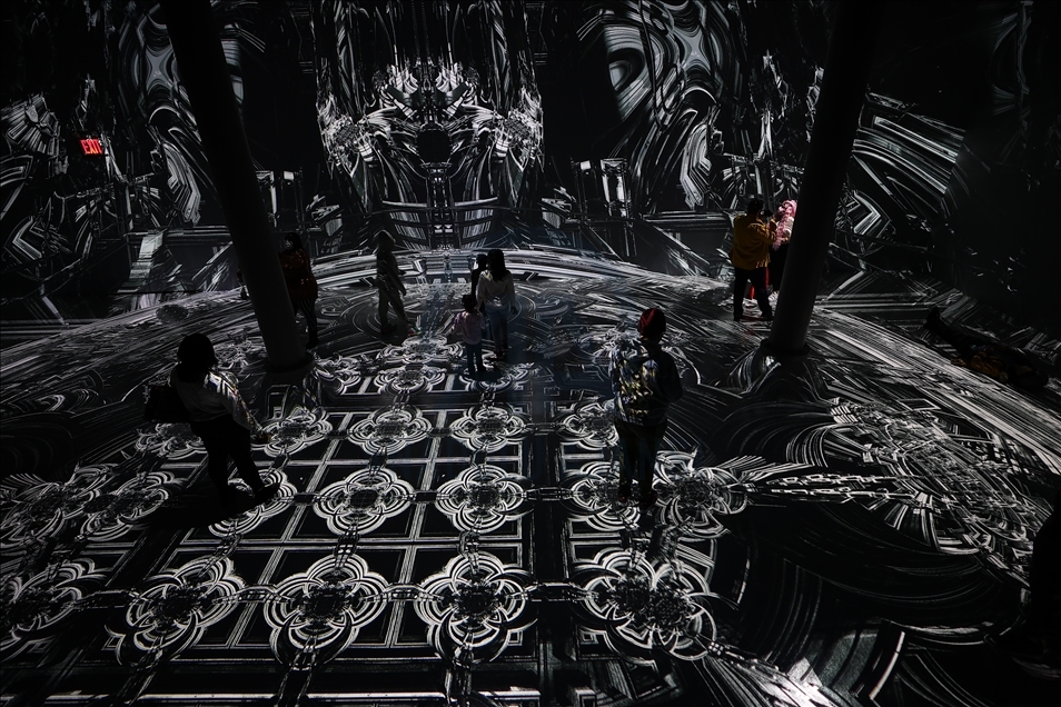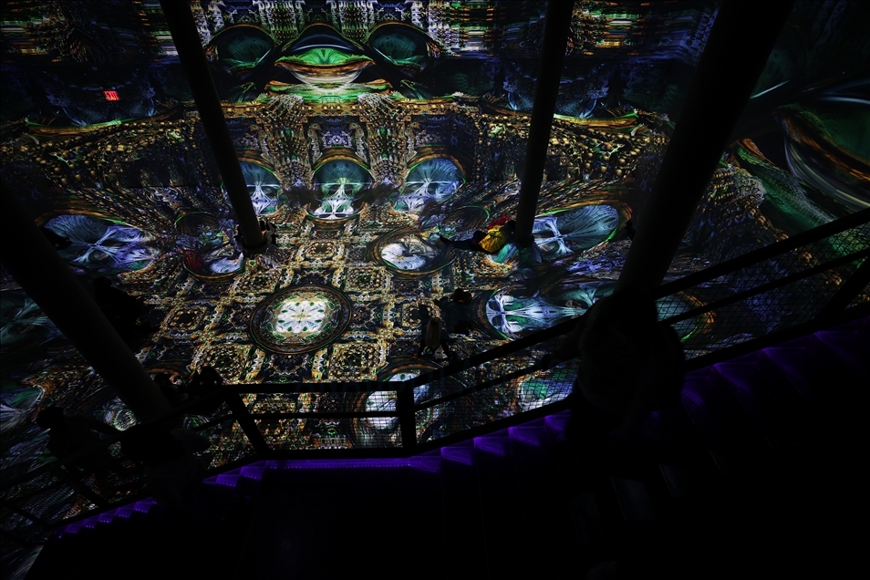 People enjoy the immersive audio-visual exhibition, Geometric Properties by Julius Horsthuis, an award-winning visual and fractal artist from Amsterdam at the ARTECHOUSE in Manhattan of New York City, United States on March 04, 2021.