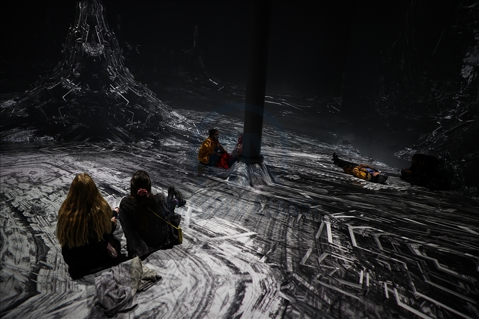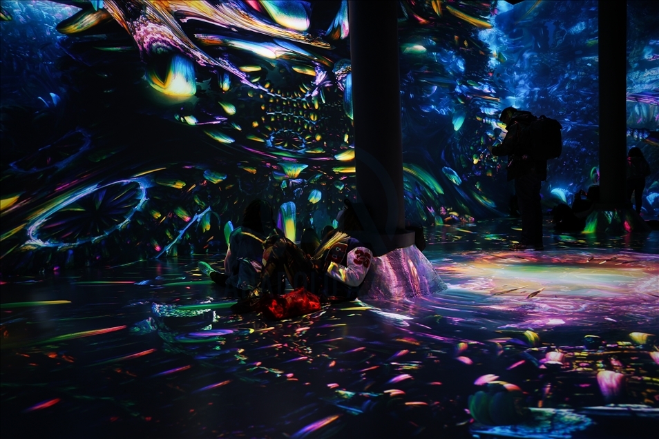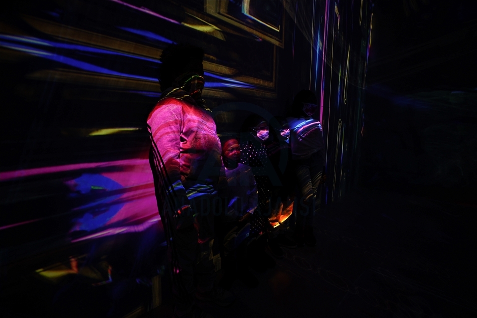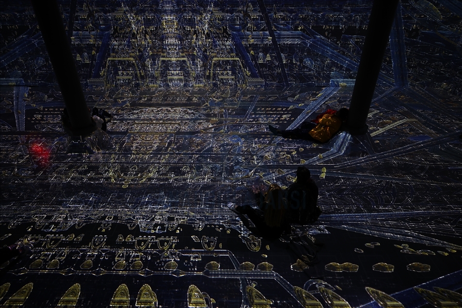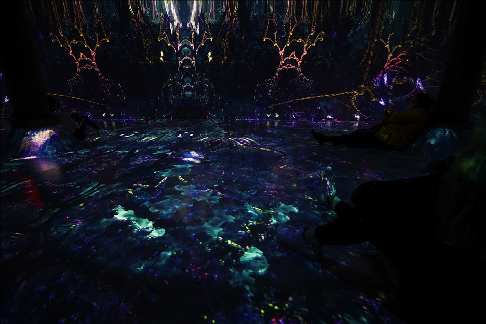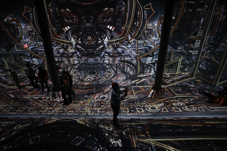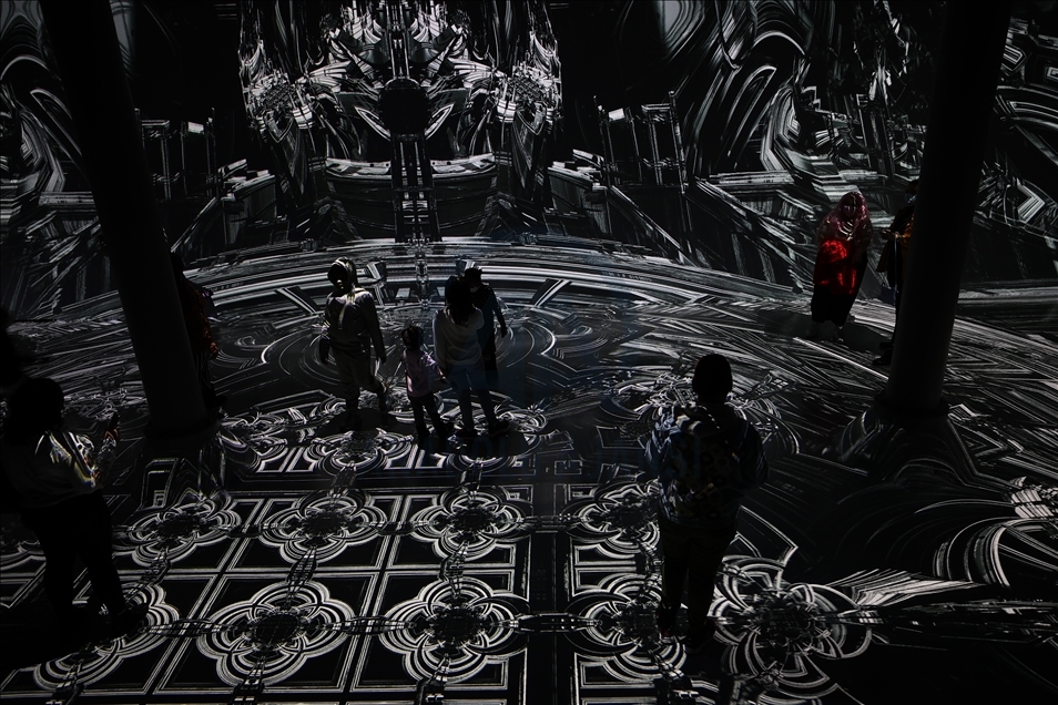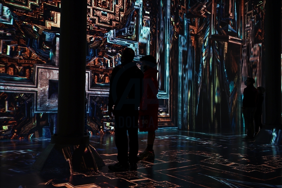 People enjoy the immersive audio-visual exhibition, Geometric Properties by Julius Horsthuis, an award-winning visual and fractal artist from Amsterdam at the ARTECHOUSE in Manhattan of New York City, United States on March 04, 2021.