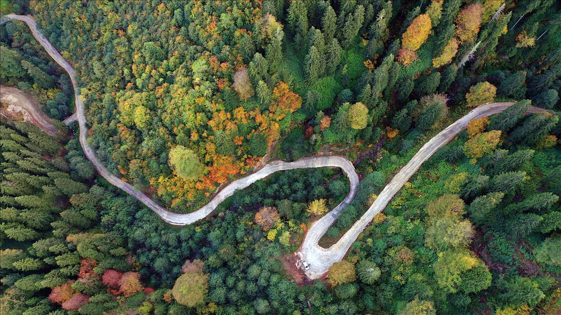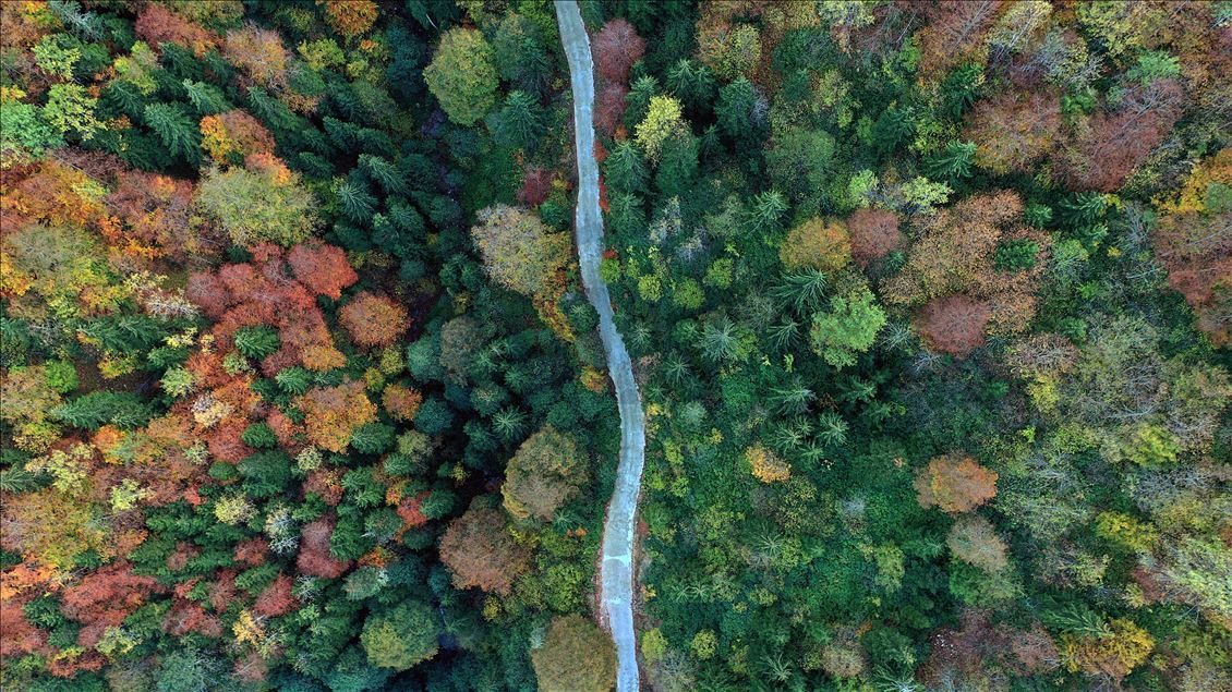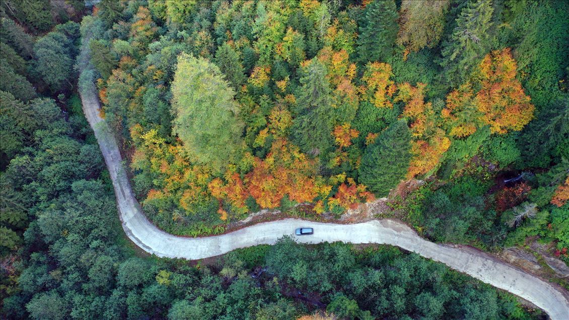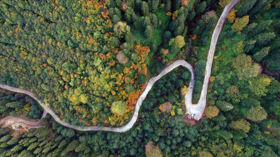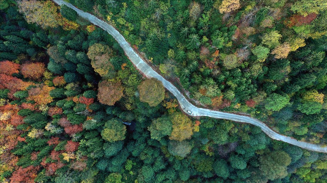 GUMUSHANE, TURKEY - OCTOBER 22: Drone photo shows a road running through forest with trees with autumn colors in Spider Forests in Gumushane, Turkey on October 22, 2020. The area of 2 thousand 630 decares, located in the borders of Yeşilköy in the Kurdun district was declared as "Spider Forest Nature Protection Area" in 1998. There are four spruce and fir trees which were registered as natural monuments and are estimated to be around 400 years old. ( Hakan Burak Altunöz - Anadolu Agency )Hakan Burak Altunöz