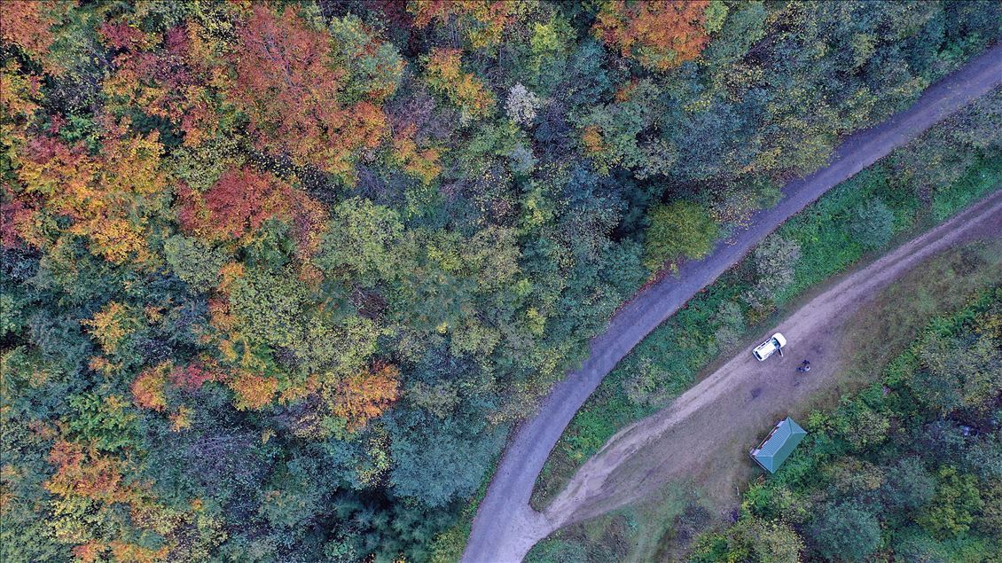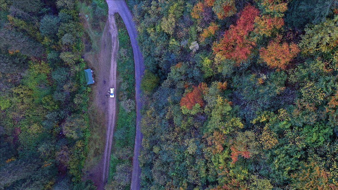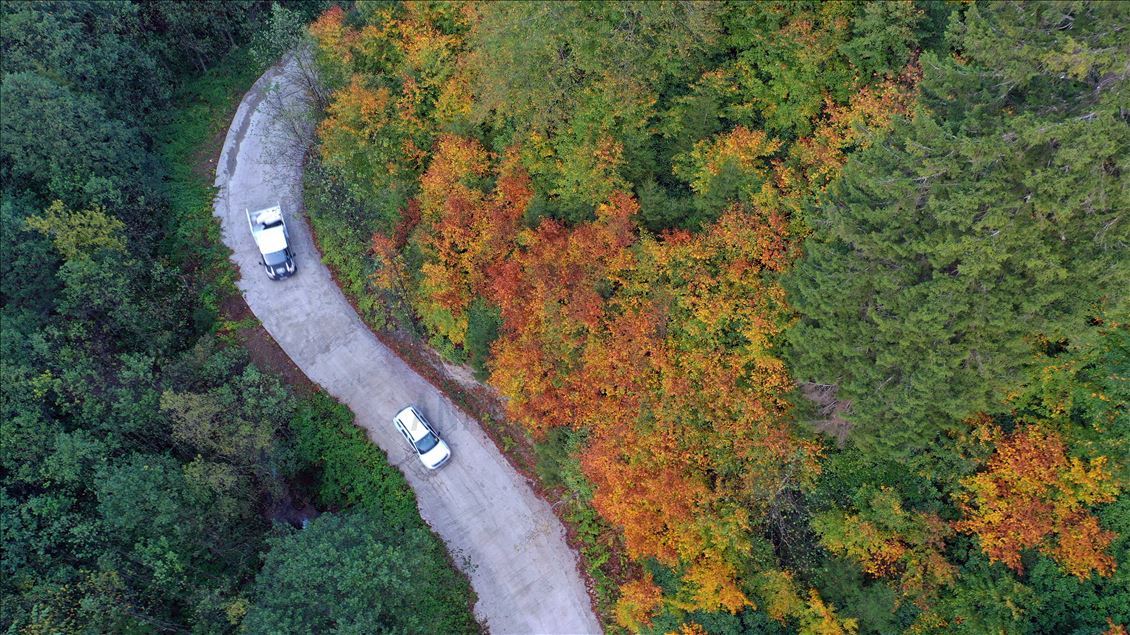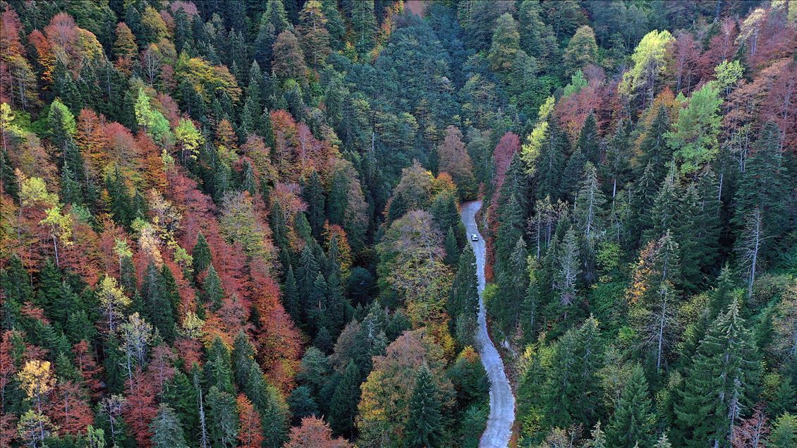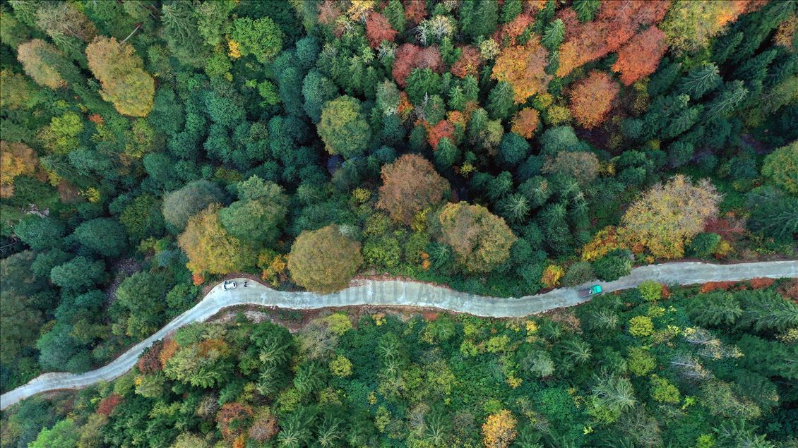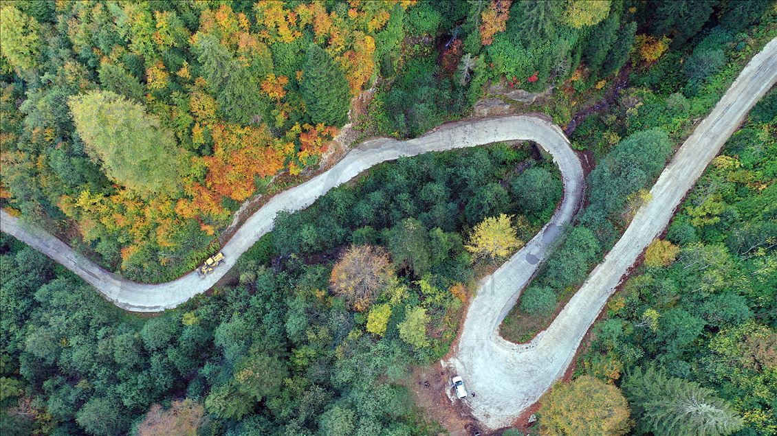 GUMUSHANE, TURKEY - OCTOBER 22: Drone photo shows a road running through forest with trees with autumn colors in Spider Forests in Gumushane, Turkey on October 22, 2020. The area of 2 thousand 630 decares, located in the borders of Yeşilköy in the Kurdun district was declared as "Spider Forest Nature Protection Area" in 1998. There are four spruce and fir trees which were registered as natural monuments and are estimated to be around 400 years old. ( Hakan Burak Altunöz - Anadolu Agency )Hakan Burak Altunöz