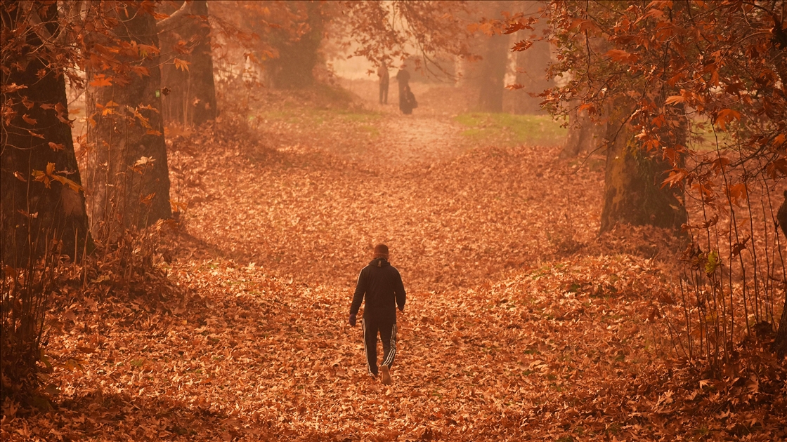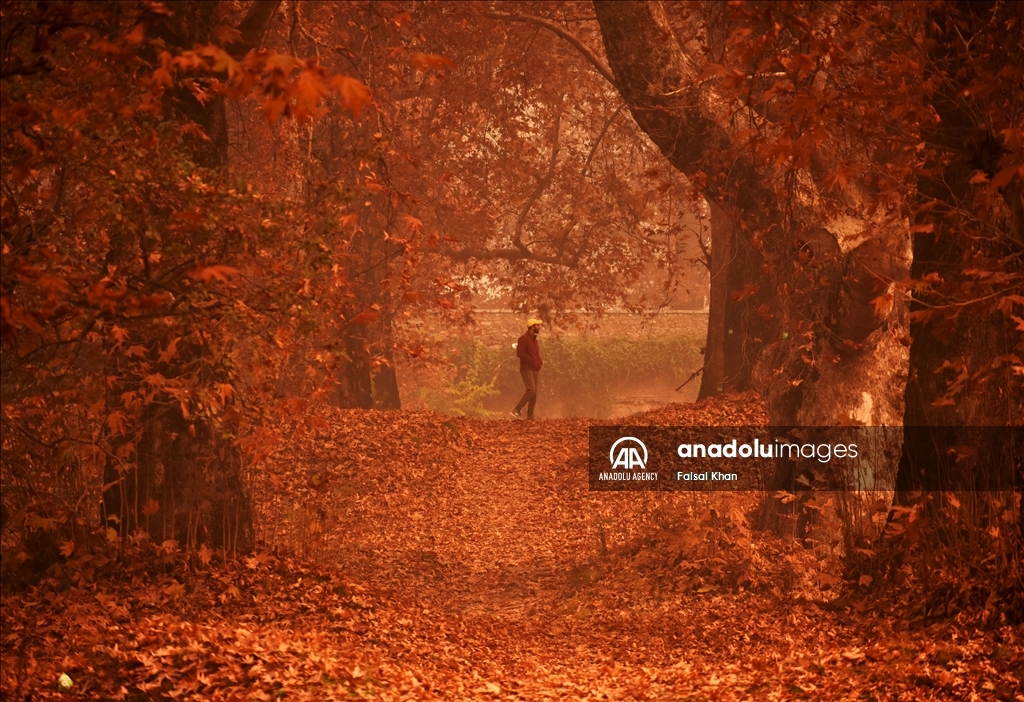 SRINAGAR, KASHMIR, INDIA - NOVEMBER 22: A man walks through the Mughal garden covered with fallen leaves of mighty Chinar trees on a cold morning in Nishat Srinagar,Kashmir on November 22, 2021.Autumn colors are reaching their peak with trees particularly Chinar changing their colors as the days are becoming shorter showcasing the approach of winter in Kashmir ( Faisal Khan - Anadolu Agency )Faisal Khan