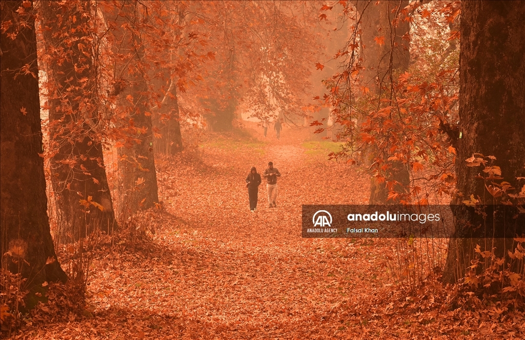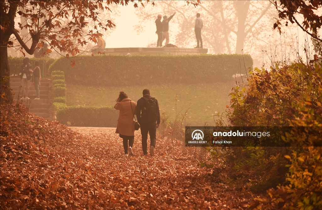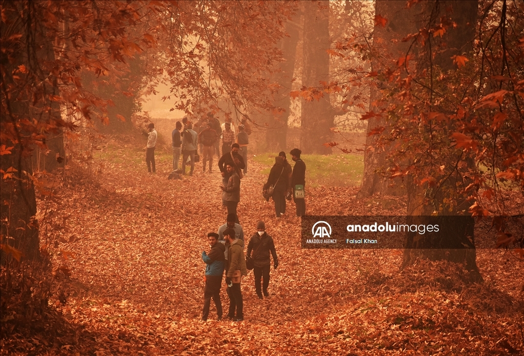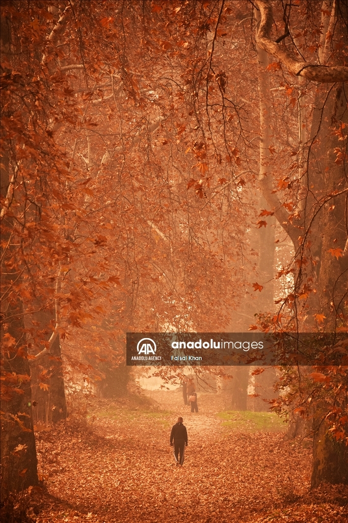 SRINAGAR, KASHMIR, INDIA - NOVEMBER 22: Indian tourists walk through the Mughal garden covered with fallen leaves of mighty Chinar trees on a cold morning in Nishat Srinagar,Kashmir on November 22, 2021.Autumn colors are reaching their peak with trees particularly Chinar changing their colors as the days are becoming shorter showcasing the approach of winter in Kashmir ( Faisal Khan - Anadolu Agency )Faisal Khan