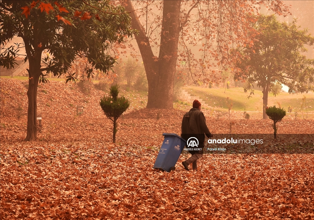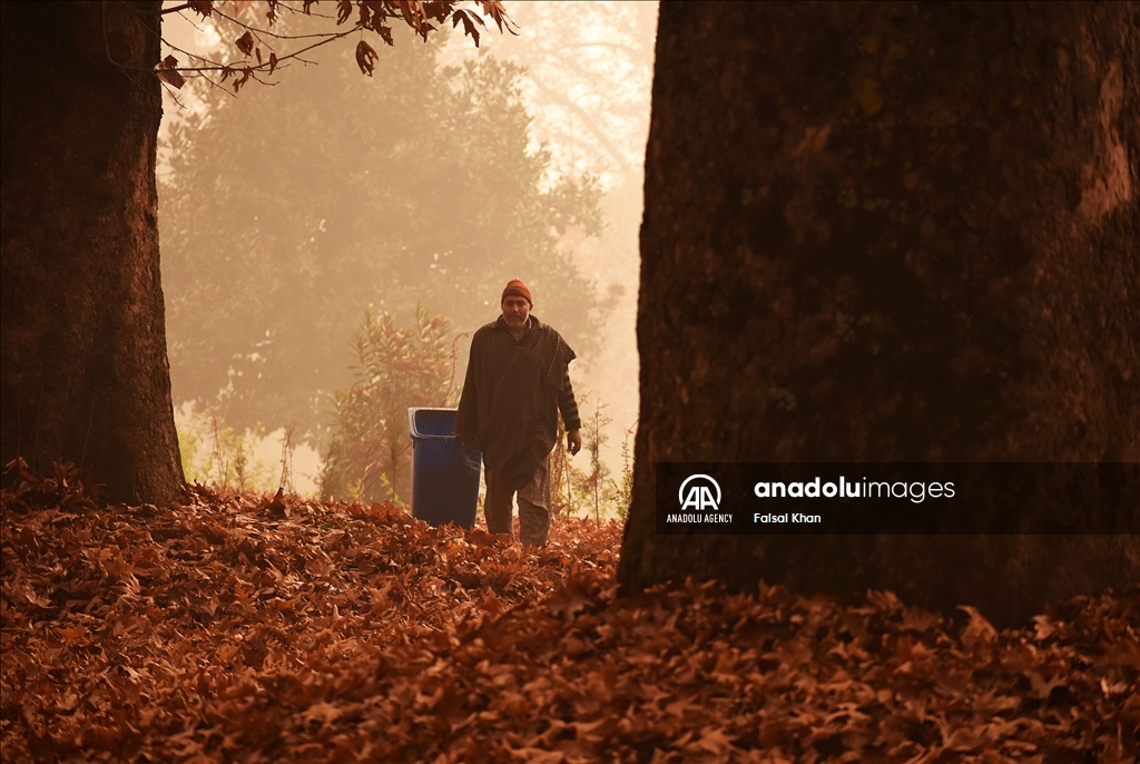SRINAGAR, KASHMIR, INDIA - NOVEMBER 22: A gardener walks through the Mughal garden covered with fallen leaves of mighty Chinar trees on a cold morning in Nishat Srinagar,Kashmir on November 22, 2021.Autumn colors are reaching their peak with trees particularly Chinar changing their colors as the days are becoming shorter showcasing the approach of winter in Kashmir ( Faisal Khan - Anadolu Agency )Faisal Khan