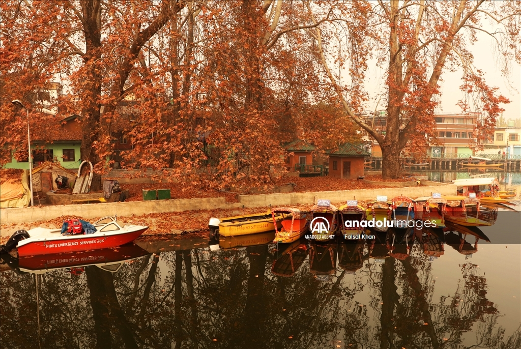 SRINAGAR, KASHMIR, INDIA - NOVEMBER 22: Shikaras (boats) are tied near the bank of famed Dal Lake on a cold Autumn day morning in Srinagar,Kashmir on November 22, 2021.Autumn colors are reaching their peak with trees particularly Chinar changing their colors as the days are becoming shorter showcasing the approach of winter in Kashmir ( Faisal Khan - Anadolu Agency )Faisal Khan