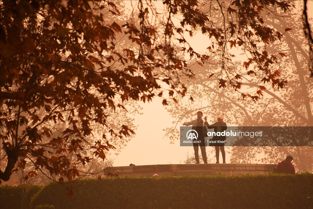 SRINAGAR, KASHMIR, INDIA - NOVEMBER 22: Indian tourists take pictures in the Mughal garden surrounded with mighty Chinar trees on a cold morning in Nishat Srinagar,Kashmir on November 22, 2021.Autumn colors are reaching their peak with trees particularly Chinar changing their colors as the days are becoming shorter showcasing the approach of winter in Kashmir ( Faisal Khan - Anadolu Agency )Faisal Khan