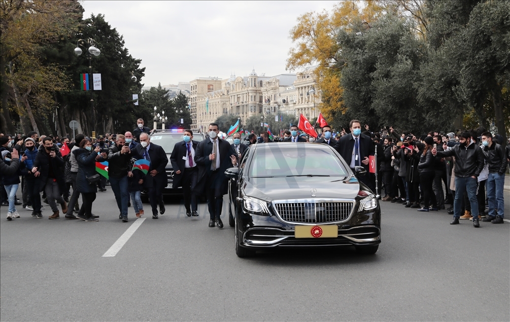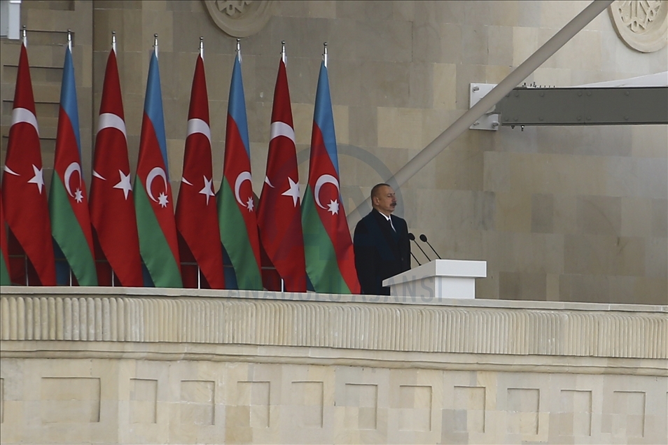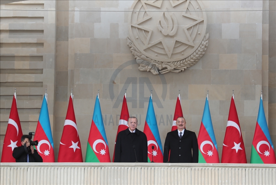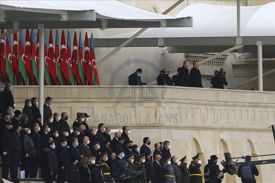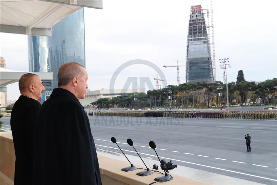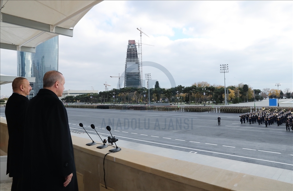 President of Turkey, Recep Tayyip Erdogan (2nd R) and Azerbaijani President Ilham Aliyev (R) view the soldiers and honor guards during the Victory Parade held to celebrate Azerbaijani army's victory in Nagorno-Karabakh on December 10, 2020 in Baku, Azerbaijan.