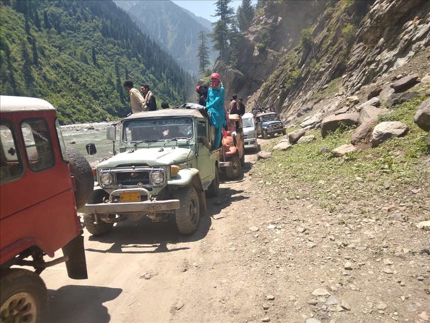 AZAD KASHMIR, PAKISTAN - JULY 18: A convoy of over two dozen jeeps and buses is making its way on a narrow and battered hilly road along the gushing waters of Neelam River also known as Kishanganga River ahead of election of regional assembly planned to be on July 25, in Azad Kashmir, Pakistan on July 18, 2021. Just a few months ago, this remote mountainous northern strip of Pakistan-administered Kashmir or Azad Jammu and Kashmir (AJK) called Neelam Valley was blazing with bullets as Indian and Pakistani forces were exchanging fire. ( Amir Latif Arain - Anadolu Agency )Amir Latif Arain