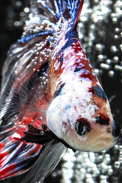 CHICAGO, USA - MAY 23: Siamese Fighting Fish also known as Betta splendens are seen in an aquarium in Chicago, United States on May 23, 2018. Betta splendens are found in wide rice paddies in Thailand, Cambodia, Vietnam and Malaysia. Now,the most common species in the world-wide aquarium trade, these fish have been introduced to all over the world and populations are thought to be established in many of these places. A Siamese fighting fish in the colors of the Thai flag has broken the record of the most expensive fighter fish ever sold after it was bought for a record-breaking amount (£1,200) at an online auction in Bangkok.