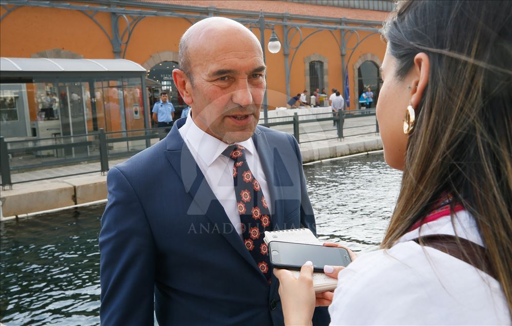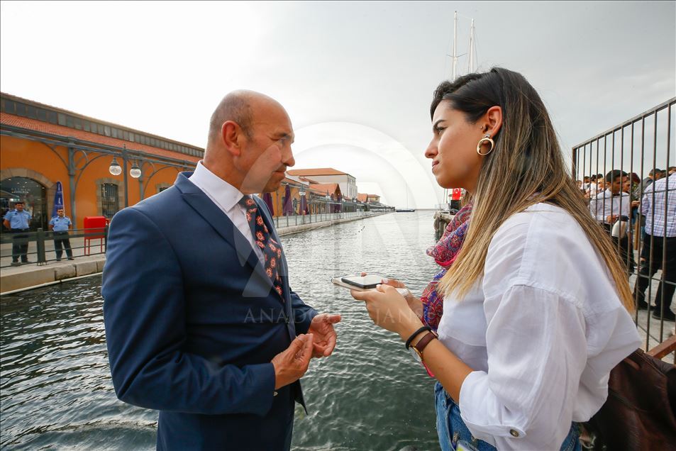 IZMIR, TURKEY - OCTOBER 4 : Mayor of Izmir Metropolitan Municipality Tunc Soyer speaks to media after signing a letter of intent with WWF which has docked its Blue Panda sailboat off the city's coast to mobilize people against plastic pollution in Izmir, Turkey on October 4, 2019. ( Evren Atalay - Anadolu Agency )Evren Atalay