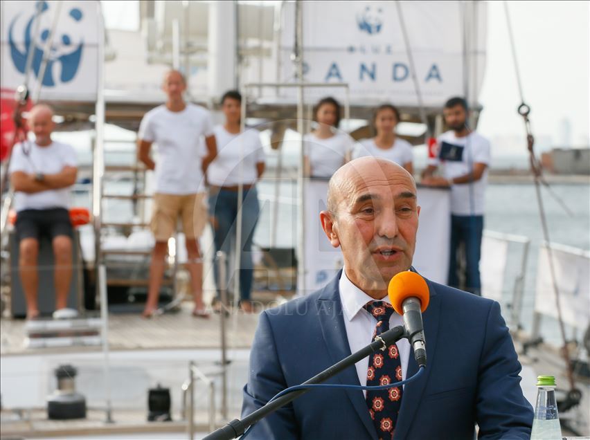 IZMIR, TURKEY - OCTOBER 4 : Mayor of Izmir Metropolitan Municipality Tunc Soyer speaks during a press conference after signing a letter of intent with WWF which has docked its Blue Panda sailboat off the city's coast to mobilize people against plastic pollution in Izmir, Turkey on October 4, 2019. ( Evren Atalay - Anadolu Agency )Evren Atalay