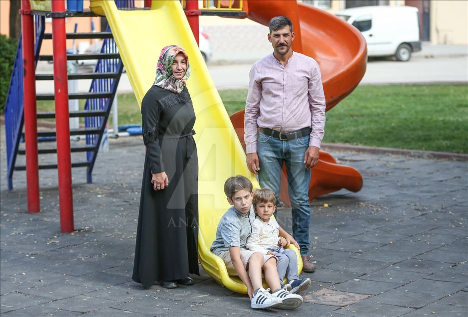 BURSA, TURKEY - SEPTEMBER 26: Mehmet Selman (2nd L) and Kerem Selman (2nd R), brothers who have heterochromia, which means different colors with blue, green and brown eyes etc., pose for a photo with their parents Suat (R) and Esra Selman (L) in Inegol district of Bursa, Turkey on September 26, 2019. ( Sergen Sezgin - Anadolu Agency )Sergen Sezgin